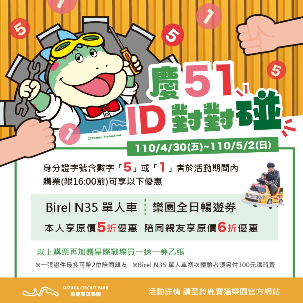 高雄市區內,搭捷運就能直達的鈴鹿賽道樂園在51連假推出「慶51 ID對對碰」優惠活動,4/30到5/2一連4天都享優惠,只要在活動期間購票出示身分證內有數字5或1,就能享原票價5折優惠,不僅如此,最多還能約2位陪玩親友以6折購票入園同樂!