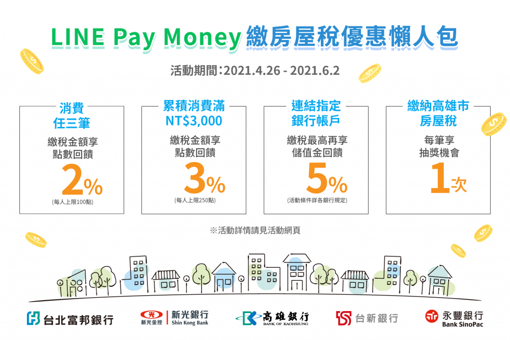 一卡通公司為讓民眾更加熟悉行動支付的功能及便利性,繼祭出牌照稅早鳥回饋活動頗獲好評,現在再推房屋稅優惠,6/2前,使用LINE Pay Money消費任3筆,繳房屋稅可享LINE POINTS 2%點數回饋(每帳號最高回饋100點),活動期間累積消費滿3000元,繳房屋稅也可享LINE POINTS 3%點數回饋(每帳號最高回饋250點),連結台北富邦、新光銀行OMNI-U數位存款帳戶、台新銀行、永豐銀行或高雄銀行帳戶並儲值,符合指定銀行加碼回饋資格,最高再享儲值金5%回饋(銀行條件與回饋上限詳見各行規定)。