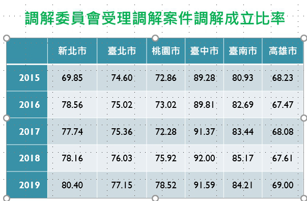 童燕珍翻出2015-2019年的數據,高雄市的調解成立比率一直都不到70%,反觀其他五都都在80%上下,台中市的調解成功率更是高達91.59%,與高雄的69%相差超過20%的成功率。