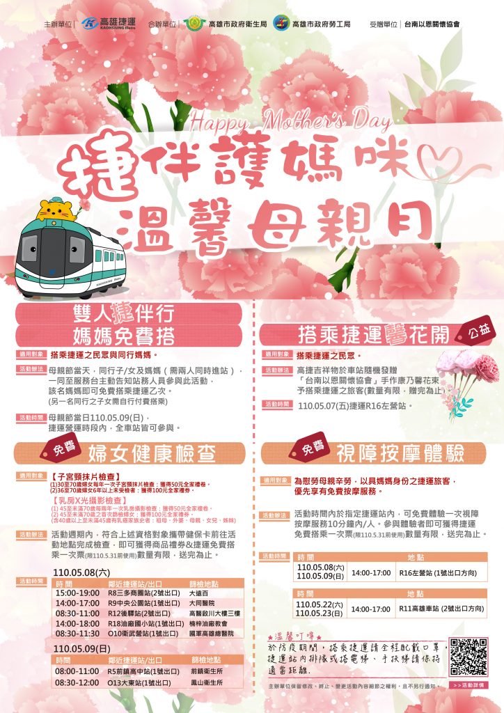 為慰勞媽媽辛勞5/8與5/9在左營站、5/22與5/23在高雄車站下午14:00至17:00,都有媽咪專屬免費視障按摩服務紓壓體驗,相關活動詳情,可致電高捷客服中心(07)793-8888或至高捷公司官網(https://reurl.cc/zb90pN)查詢。