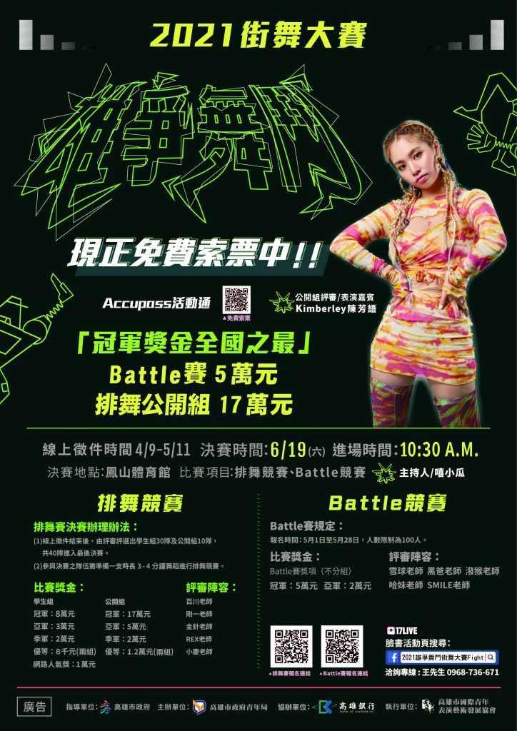 「2021雄爭舞鬥街舞大賽」報名截止倒數中!由高市青年局主辦的雄爭舞鬥街舞大賽,排舞初賽線上影片甄選至5/11止,Battle項目報名至5/28止,兩項目入選名單6/8將在青年局官網公布, 6/19鳳山體育館決戰舞技,想到場同嗨的民眾5/15起可至Accupass活動通免費索票,數量有限索完為止。