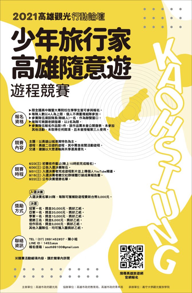 「高雄觀光青年志工論壇」及「高雄少年旅行家遊程競賽」即日起開放報名。更多相關資訊可上青年志工論壇報名網址(https://reurl.cc/8ymQjM)或高雄旅遊網(https://khh.travel)了解。
