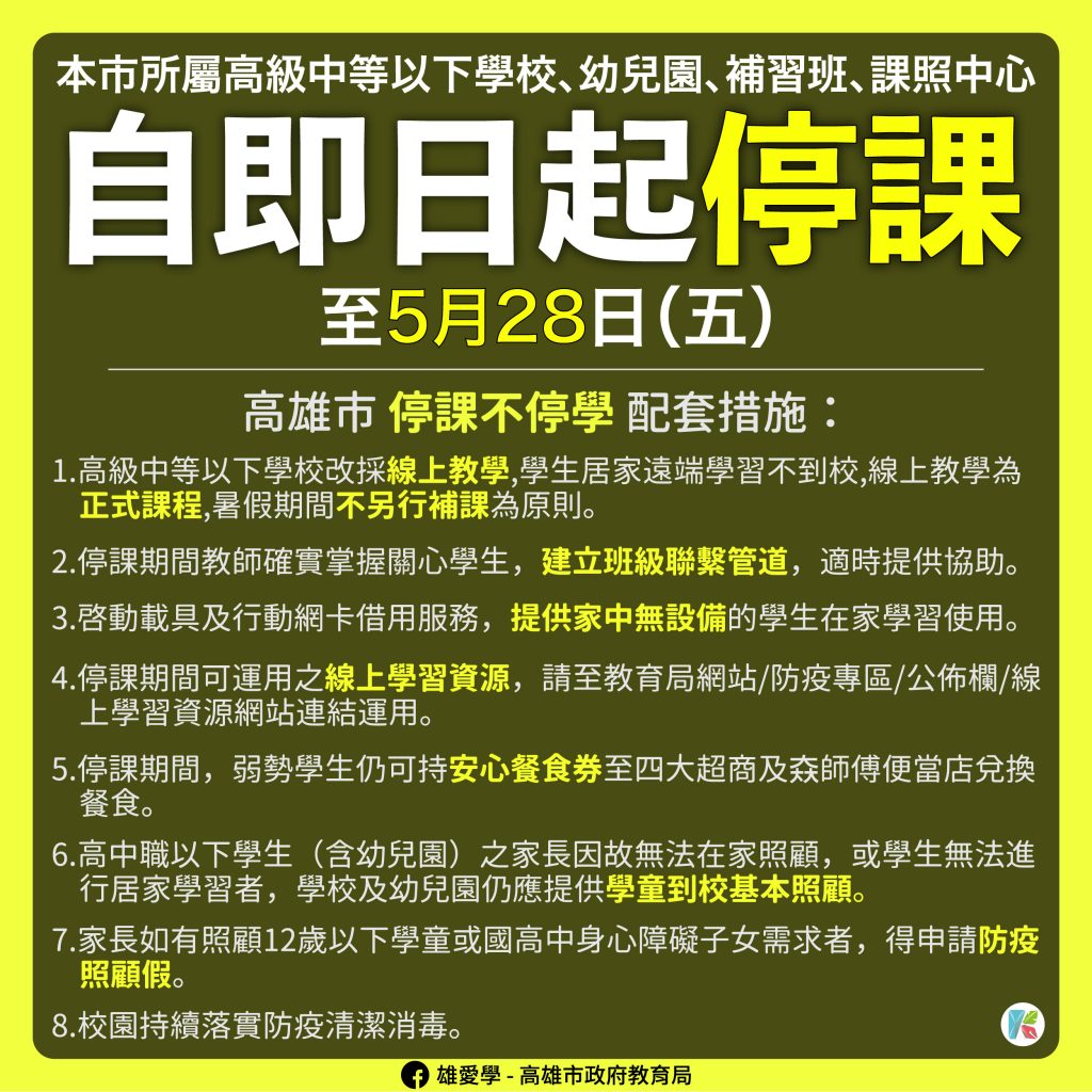 因應全台停課,高市教育局今(18)日提出因應措施,將以停課不停學方式提供高中以下學校進行遠端學習,此外提供載具與行動網卡給無設備的學生借用,弱勢學生停課期間可持安心餐食券到超商、?師傅便當店兌換餐食,此外國小及幼兒園家長若無法在家照顧,仍可讓學童到校,學校及幼兒園應提供學童到校基本照顧。