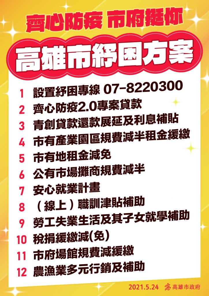 新冠疫情衝擊百業,現階段防疫措施已對經濟造成影響,不少民眾面臨無薪假,生活與經濟備受挑戰,高雄市政府公佈12項紓困措施,齊心防疫2.0專案貸款、包括設置紓困專線07-822-0300,希望與所有市民朋友一起齊心努力、共度難關。