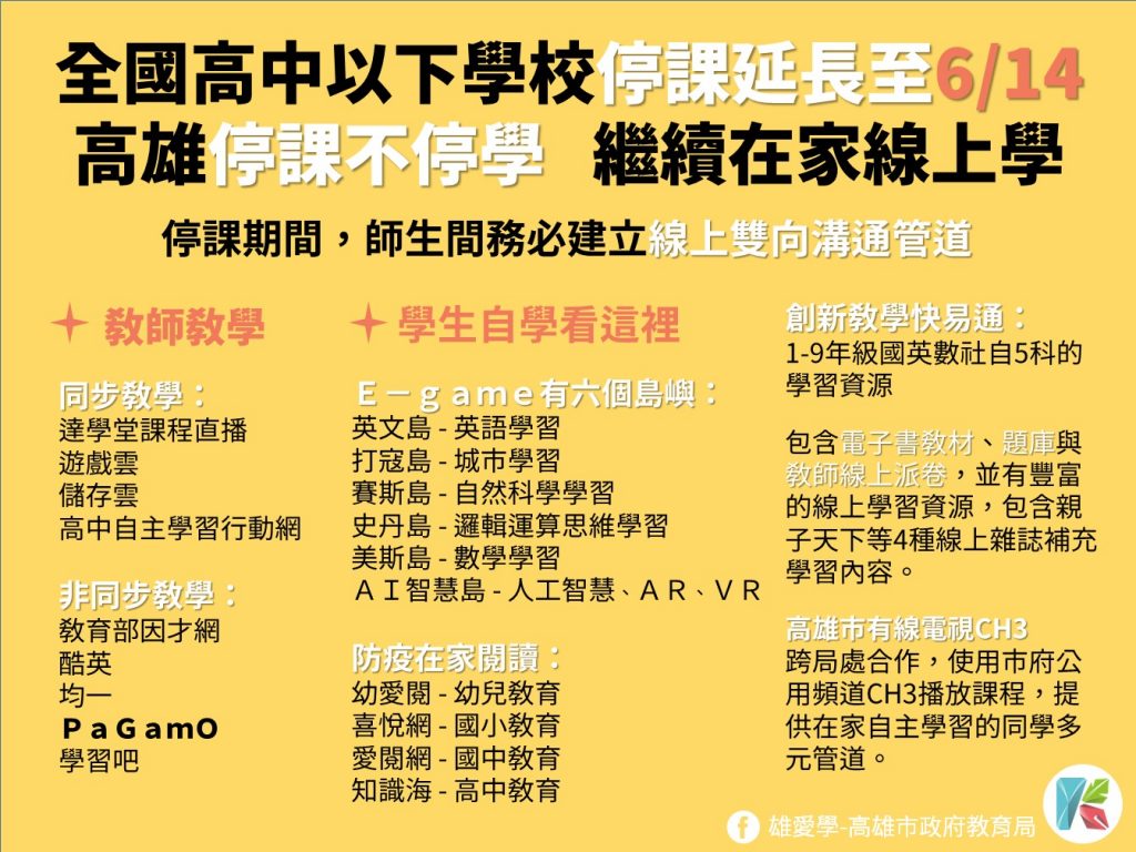 全國受新冠疫情升溫影響,教育部再延長高中以下學校停課時間到6/14,高雄市維持原先的「停課不停學」對策,防疫期間,學生在家可透過高市教育局、教育部與民間數位學習資源、平台與工具,在家自主學習。