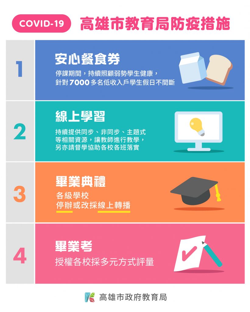 謝文斌指出,教育局局網的防疫專區彙整相關數位學習的資源,透過快易通平台與防疫專區的線上學習資源與多元課程內容,讓學生與教師都能在家線上自學、共學與線上教學,請教師優先與學生建立線上雙向溝通管道,可運用如Google Meet、Miscrosoft Teams、Line、Facebook等慣用數位方式進行連結,另外延長停課期間的安心餐食券會繼續發放,讓弱勢孩子在假日也能用餐。