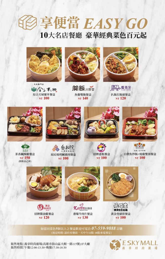 因應防疫餐飲全面提供外帶,到店大啖美食的小確幸只能暫停,業者紛紛搶攻宅經濟市場,滿足民眾生活需求,高雄義享時尚廣場即日起提供「享安心EASY GO」快取服務,超過50家品牌「享外帶」享5折起優惠,午晚餐時段「享便當EASY GO~豪華美食餐車」提供限量百元餐盒等美食雙服務,防疫期間也能盡享美食。