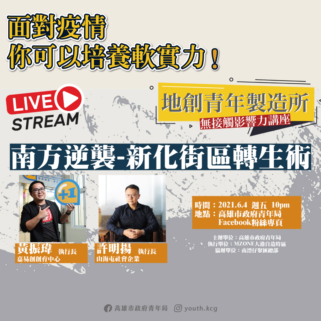 新冠疫情影響之下,許多人宅在家的時間也變多,高市青年局順應「宅」趨勢,開辦線上青年培力課程講座,由M.ZONE大港自造特區首波推出「地創青年製造所」系列,6/4晚上10點在青年局粉絲專頁直播,疫情衝擊下如何培養軟實力創商機?別忘準時收看生放送,防疫宅在家也能變行家!