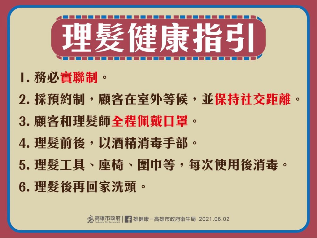大高雄醫師公會的王宏育說明,理髮屬於美國德州醫學會公佈的第六級風險場域,建議民眾這陣子能不去就不要去,他也提醒,若要去請務必依照6點理髮健康指引,除了實聨制、預約制之外,等待理髮時應保持社交距離,最好能在室外等待,而理髮師與顧客全程都要配戴口罩,剪髮前後包括工具、座椅圍巾都要用酒精確實消毒,使用一次性圍巾更好,最好剪完頭髮回家再洗頭,縮短剪髮時間。