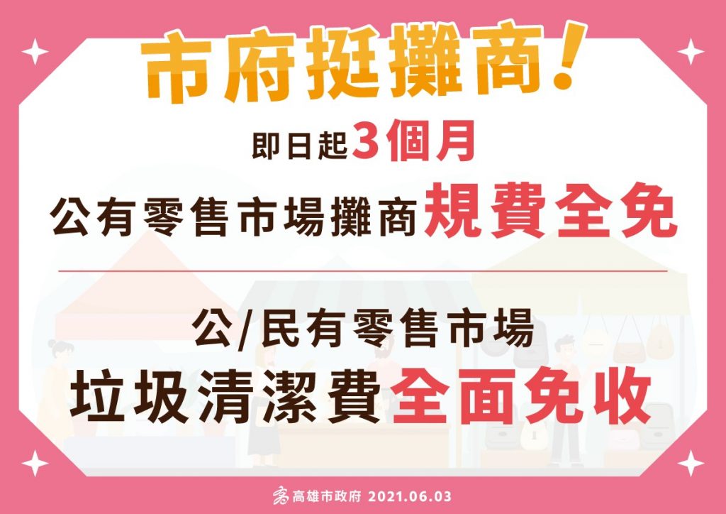 為降低染疫風險,高雄市政府落實傳統市場防疫,執行實聯制、出入口管制及身分證尾數分流消費等措施,為感謝攤商配合,即日起3個月公有零售市場攤商規費全面,再加碼不分公、民營市場垃圾清潔費免收,力挺攤商共度防疫關鍵期。