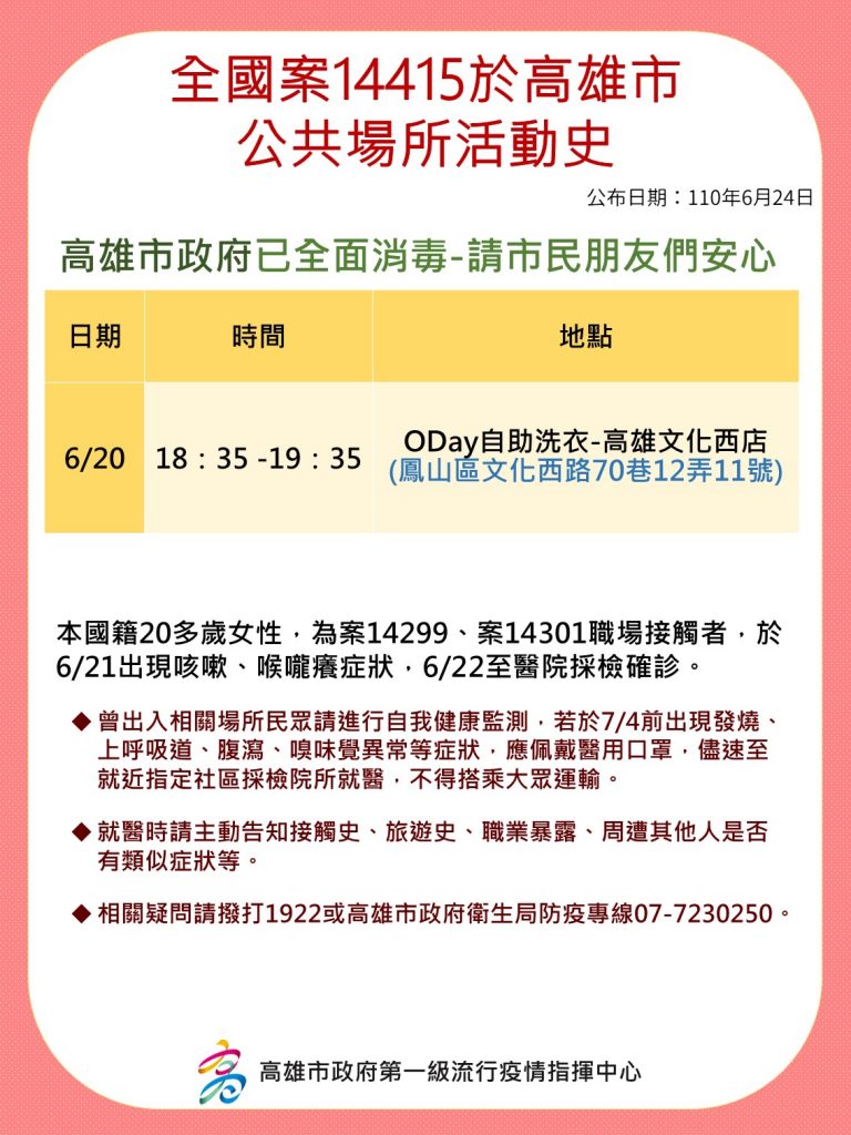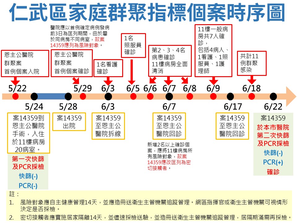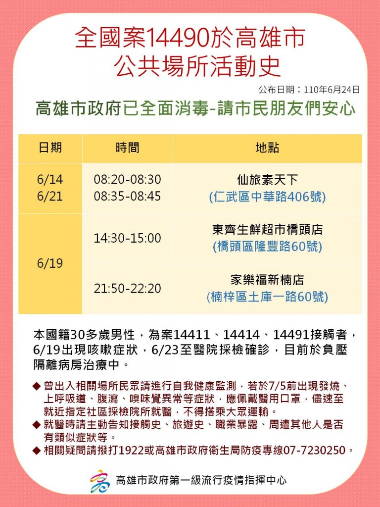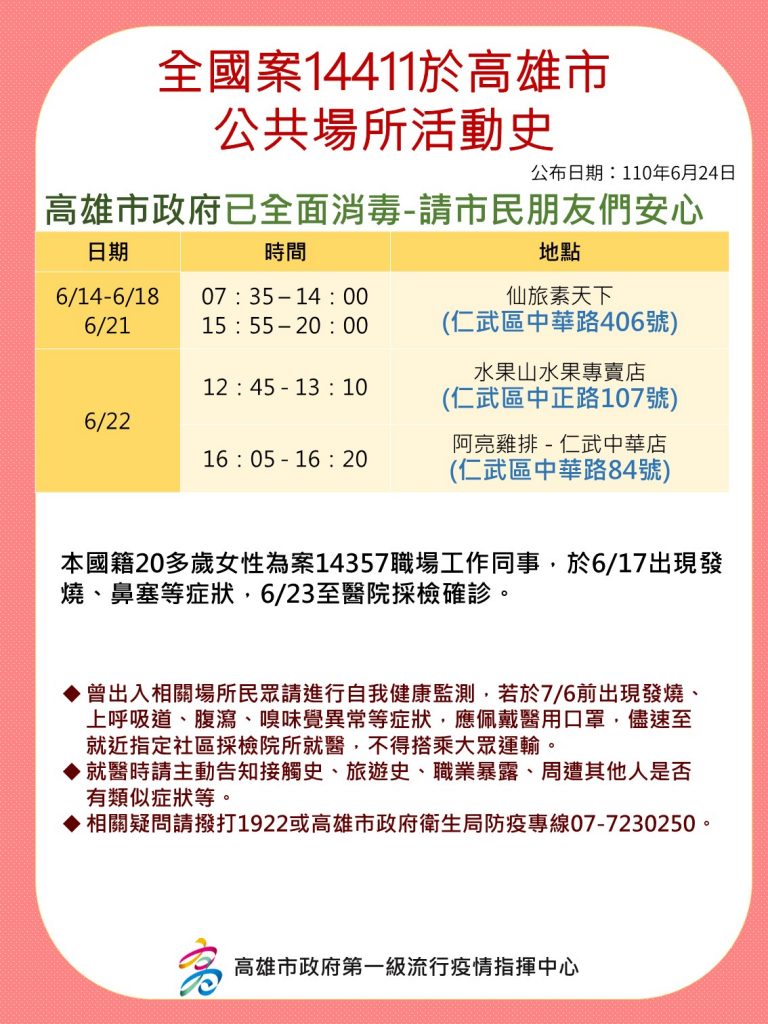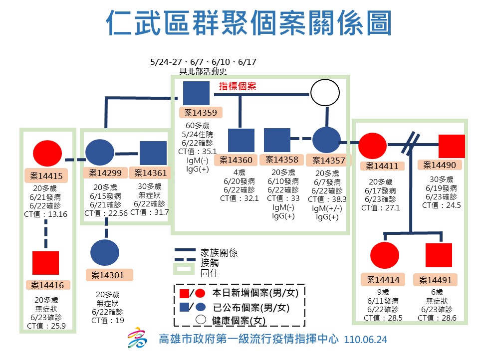 衛生局補充,案14357(20多歲)透過職場接觸傳染給案14411(20多歲女性),造成同住的案14490(33歲男性),兩人因育有2子經常性需要共同照護案144141( 9歲童)與案 14491(6歲童),案14414因停課緣故,常與母親(案14411)到工作處,在6/23案14357確診後,案14411隨之被匡列進而確診。