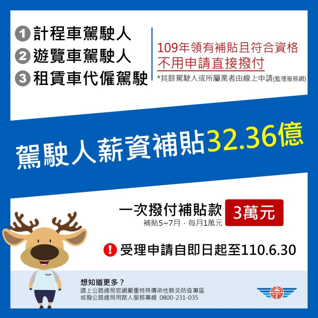 交通局進一步說明,高雄計程車9510人、遊覽車1537人,薪資補貼3萬元由高雄區及高雄市區監理所積極辦理,在這個月21日都已全部入帳。交通局補充,依公路總局公布的規定,需在6/30前上公路總局網站完成線上申辦,呼籲新加入或去年沒有申請的運將朋友,把握時效在6月底前完成線上申辦。