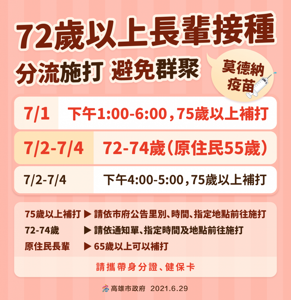 高市衛生局說明,7/2到7/4施打72到74歲長輩(原住民55歲),將規劃49處社區疫苗接種站,請民眾依照接獲通知單上的指定時間地點,帶身分證、健保卡、通知單依序前往施打。分流施打,避免群聚。 7/1 共9個施打站,分別是莊敬國小、巨蛋體育館、五甲龍成宮、鳳山體育館、展覽館、高雄科技大學楠梓校區、小港高中、岡山農工、美濃國中體育館。