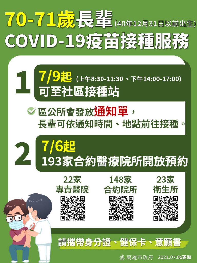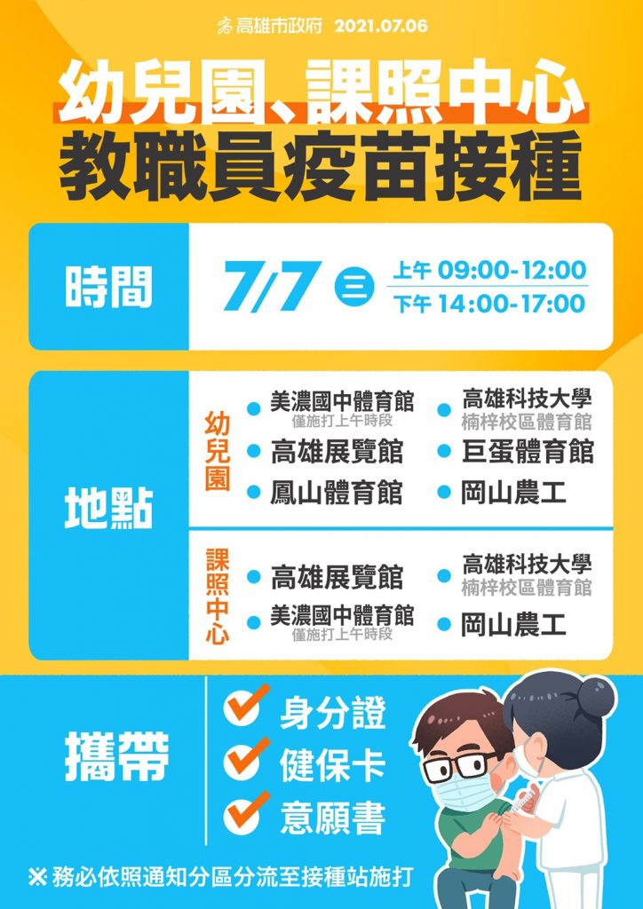 陳其邁指出,雖然中央的疫苗還沒抵達,但市府現有疫苗餘額,為了加速未來幼兒園與課照中心開放的進度,高雄率先開打,他也呼籲符合資格的對象要儘速去施打疫苗,也感謝幼兒園、課照中心的教職員,依序到大型施打站接種,他說,只要按部就班打好打滿。至於一般的市民施打,7/9起開放70歲到71歲長輩施打,他強調,長輩朋友只要在家等,按照通知到載明的時間地點,備妥相關資料前往接種站施打,同樣的有需要接送服務的民眾,也歡迎跟區公所申請接送服務!