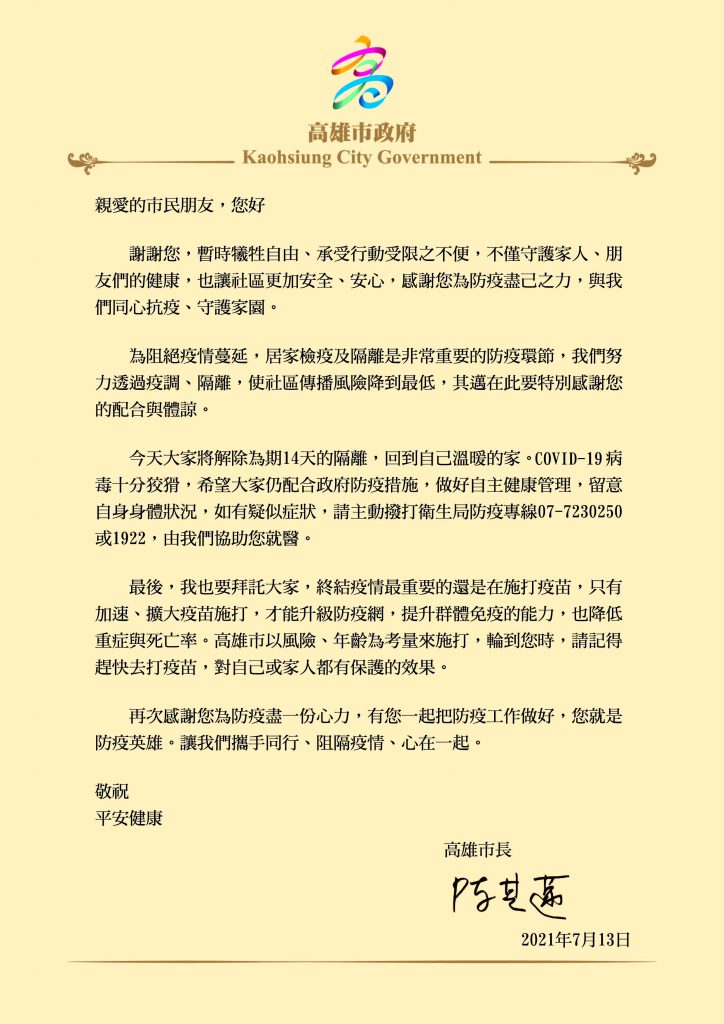 陳其邁在信中提到,居家檢疫及隔離是阻絕疫情蔓延非常重要的防疫環節,特別感謝大家承受短期行動受限之不便,與市府共同抗疫,每位住戶都是抗疫英雄;同時,陳市長也溫馨叮嚀大家解除隔離後,仍要做好自主健康管理,並再次提醒輪到施打疫苗時,一定要記得去,以保護自己及家人的健康、降低重症與死亡率、提升群體免疫的能力。