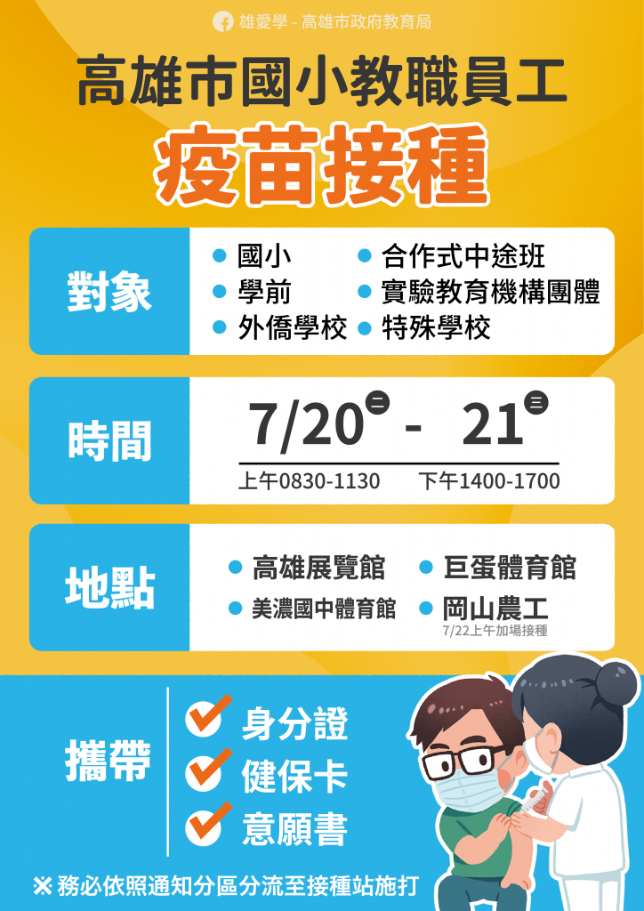 教育局表示,國小教職員工施打疫苗時間為7/20與7/21兩天,上午8:30至11:30,下午2:00至5:00,分別在高雄展覽館、巨蛋體育館與岡山農工、美濃國中體育館,另希望學校能就地施打,減少移動,岡山農工增加半天到22日上午11:30,前往接種疫苗的國小教職員工務必攜帶身份證、健保卡等。