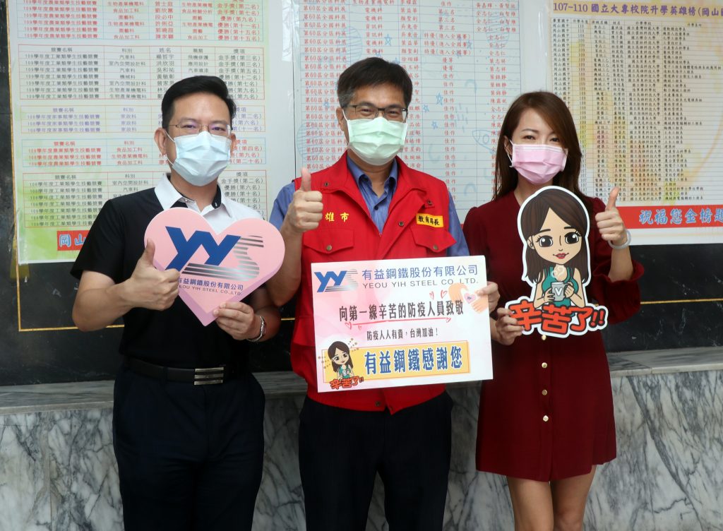 位在高雄永安工業區的有益鋼鐵是國內唯一不銹鋼厚板廠,創業至今已屆26個年頭,希望發起善念善舉,影響更多企業與好友們挽袖一起響應,支持與關懷防疫人員,同時善盡企業社會責任,也相信微笑是台灣最美好的風景、愛心是無價的免疫力,高市教育局長謝文斌代表受贈防疫愛心餐,感謝有益鋼鐵善舉,也代表大家向張睿芯總經理致謝。