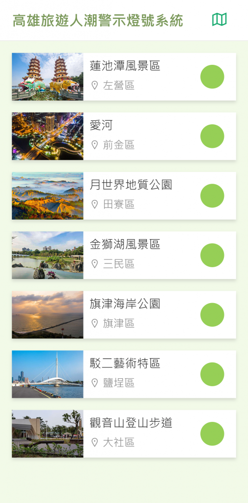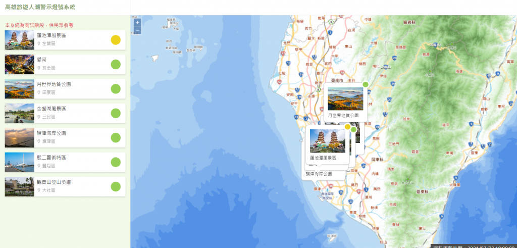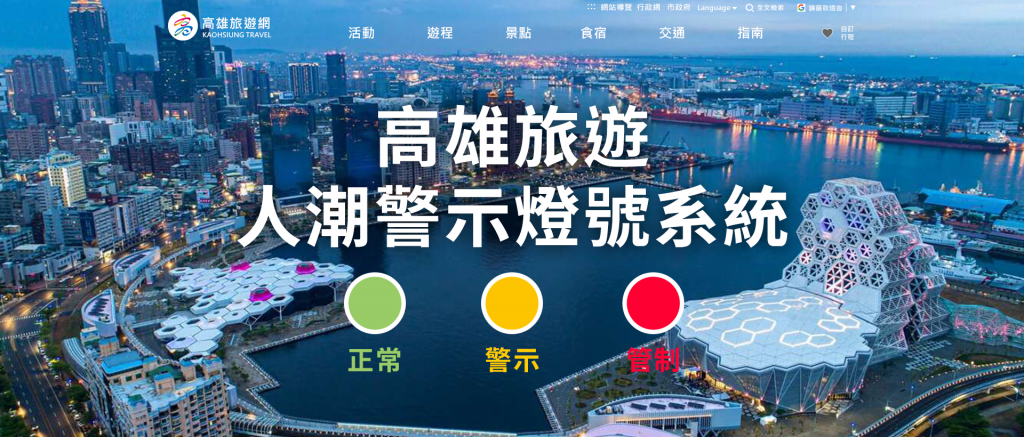 目前系統針對7大開放式熱門景點(蓮池潭、駁二、愛河、旗津、金獅湖、月世界、觀音山)提供即時人流燈號測試系統,出遊前以電腦或手機等電子設備上高雄旅遊網「高雄旅遊人潮警示燈號系統」查詢景點人流訊息,依照紅黃綠登指引,綠燈代表人人潮尚可,黃燈則是人潮略多已達警示狀況,紅燈則是人數即將過量,進行管制中。