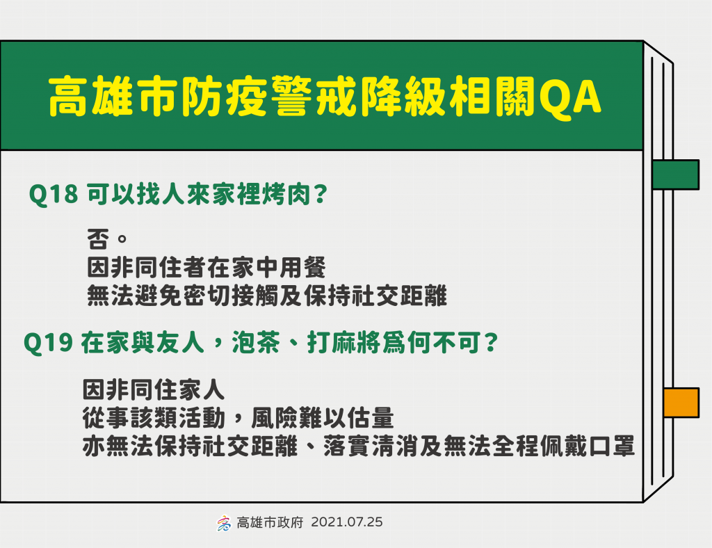 事實上在防疫降二級前,高雄市長陳其邁已經三申五令,提醒大家,高雄以積極管理有效開放的原則因應降級,陳其邁25日更在臉書回應大家說,「所有的措施,都是為了要能夠保持社交距離,避免飛沫跟接觸傳染,,桌菜、火鍋、鐵板燒、燒烤吧檯,如何落實隔板?面對面假如沒有物理性屏障,你直接口水就會噴過去,也有可能會發生飛沫傳染;他也舉例找人來家裡烤肉可不可以?陳進一步說明「不行,因為無法避免接觸及社交距離。」換句話說無法避免接觸及保持社交距離的聚會,都是禁止的。