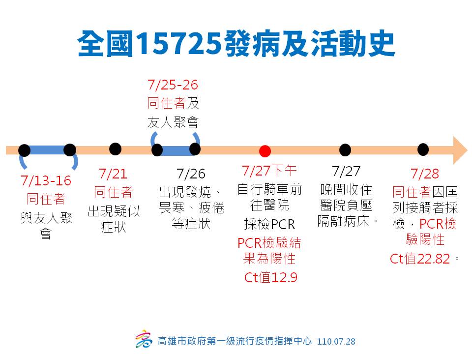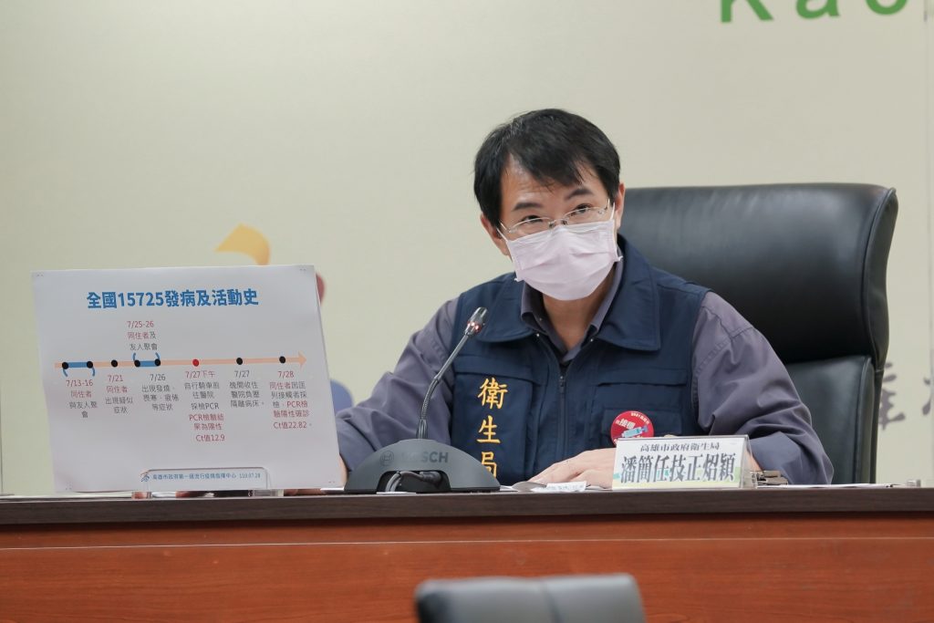 而高市衛生局簡任技正潘炤穎表示,觀察案15725的疫調狀況,也顯示他與近期國內的傳染途徑都是類似的模式,也就是說有一些群聚以及沒有戴口罩聚會等等的狀況,他在7/25到7/26與7/13到7/16與同住者,以及與北部來的友人有接觸,至於案15725同住者與友人聚會是否違反群聚規定,目前還在疫調中。