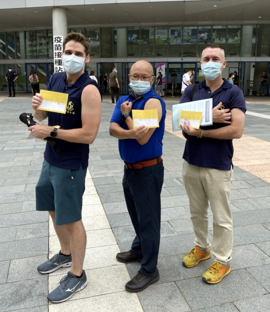另外一位加拿大渥太華的雷邁杰(Michael)與補習班同事相約打疫苗,他說自己教外語,打疫苗是主要是為了師生安全,對於世界各國捐贈疫苗給台灣,自己是「老外」也深受感動,疫苗得之不易,所以身為外國人更應率先打疫苗,相信每個人都打疫苗,可以減少更多人感染。