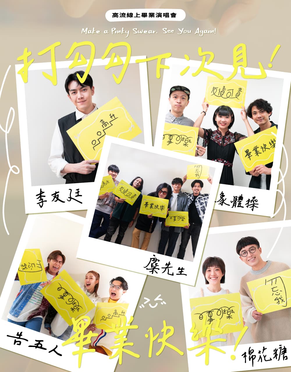 全台畢業生引頸期盼, 31日在高雄流行音樂中心舉辦的線上畢業演唱會「打勾勾·下次見」,是近日宣布降為防疫二級警戒後,後疫情時代首場完整大型線上音樂會,也是高雄市獻給全台灣畢業生今年唯一場專屬演唱會!活動邀請棉花糖、大象體操、李友廷、麋先生、告五人5組藝人為畢業生帶來愛與勇氣的歌曲,獻給畢業生,希望他們在逐夢路上擁有正能量,其中休團8年後,今年正式復出重返歌壇的棉花糖,新歌〈親愛的朋友〉唱出青春期到畢業長大後開始工作的人們,最後老友再聚首,希望彼此間友情可以長存,開場便把線上觀眾情緒帶至高點。