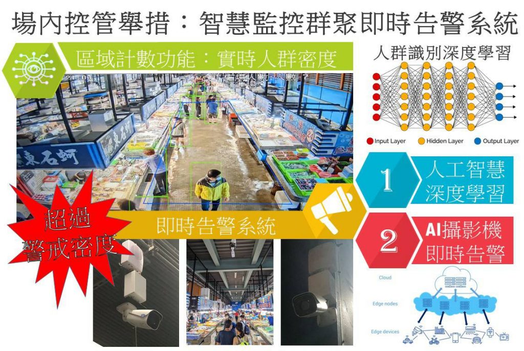 北高雄獨具魅力的觀光魚市梓官蚵子寮魚貨直銷中心,因每逢假日人潮眾多,相對提高防疫工作的難度,高雄市副市長林欽榮指出,蚵子寮魚貨直銷中心防疫措施除強化出入口管制及管控場內總人數外,避免入場後人流太過密集,產生群聚疑慮,特別引進「AI智慧監控群聚即時告警系統」藉由AI深度學習分析監控影像,能即時(Real-time)計算場內人群在空間中的分佈及密度,人群密度超國臨界值,系統會即刻啟動發出警示廣播,並同步通知管理人員,更能提醒入場採買民眾注意人潮密集。