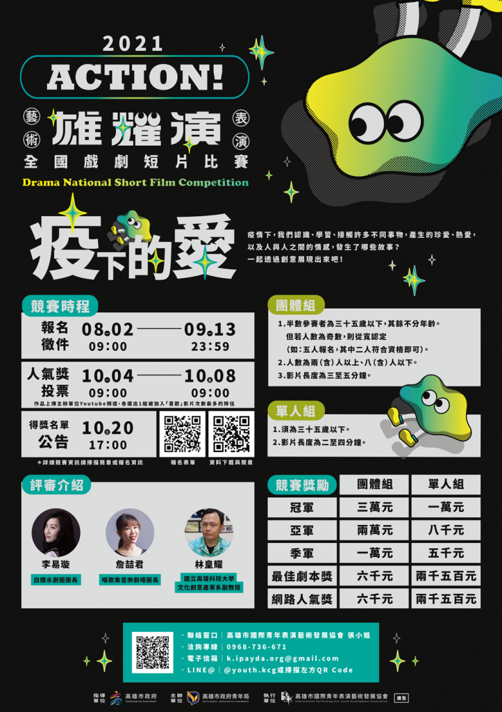 「2021 ACTION!雄耀演全國戲劇短片比賽」分為團體組及單人組,祭出總獎金10萬元,廣邀全國青年一起參與,參賽作品將由白開水劇團團長李易璇、唱歌集音樂劇場團長詹喆君及國立高雄科技大學文化創意產業系副教授林皇耀組成的專業評審團評分,評審出團體組及單人組冠軍、亞軍、季軍及最佳劇本獎,得獎名單將於10/20公佈在青年局官網。「雄耀演」競賽採線上徵件,即日起受理全國青年報名至9/13截止,賽事報名簡章請上青年局官網(https://youth.kcg.gov.tw/)下載。