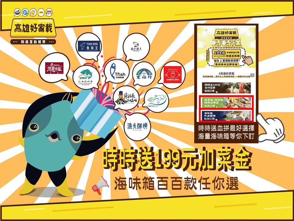 高雄好家載時時送活動倒數,你還沒加入嗎?訂餐後每天抽出1000組199元防疫互助碼,不僅可訂餐吃美食,也能訂「海量海味箱」、「揀好蔬果箱」(https://lin.ee/JgmI9hs),堪稱最狂加菜金!活動只到8/10,錯過就太可惜了!
