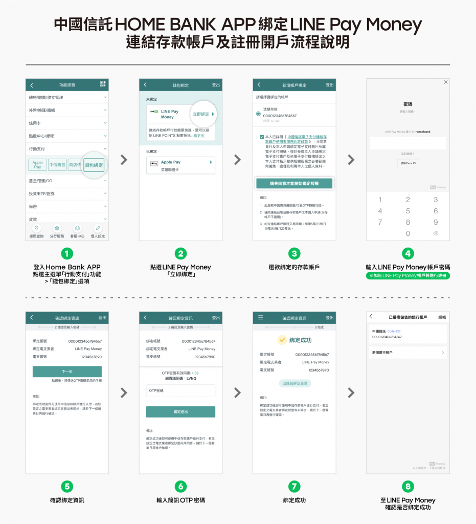 後疫情時代民眾消費多以免接觸免臨櫃線上金融科技服務為首選,現在一卡通公司再宣布首創中國信託網路銀行Home Bank APP,提供最安全方便的零接觸線上開戶服務,綁定LINE Pay Money連結中國信託存款帳戶及註冊開戶,民眾也可透過中信銀APP「行動支付」完成線上繳費等,全新的線上合作模式可彼此串聯為用戶提供免接觸、更友善便利的金融服務管道。
