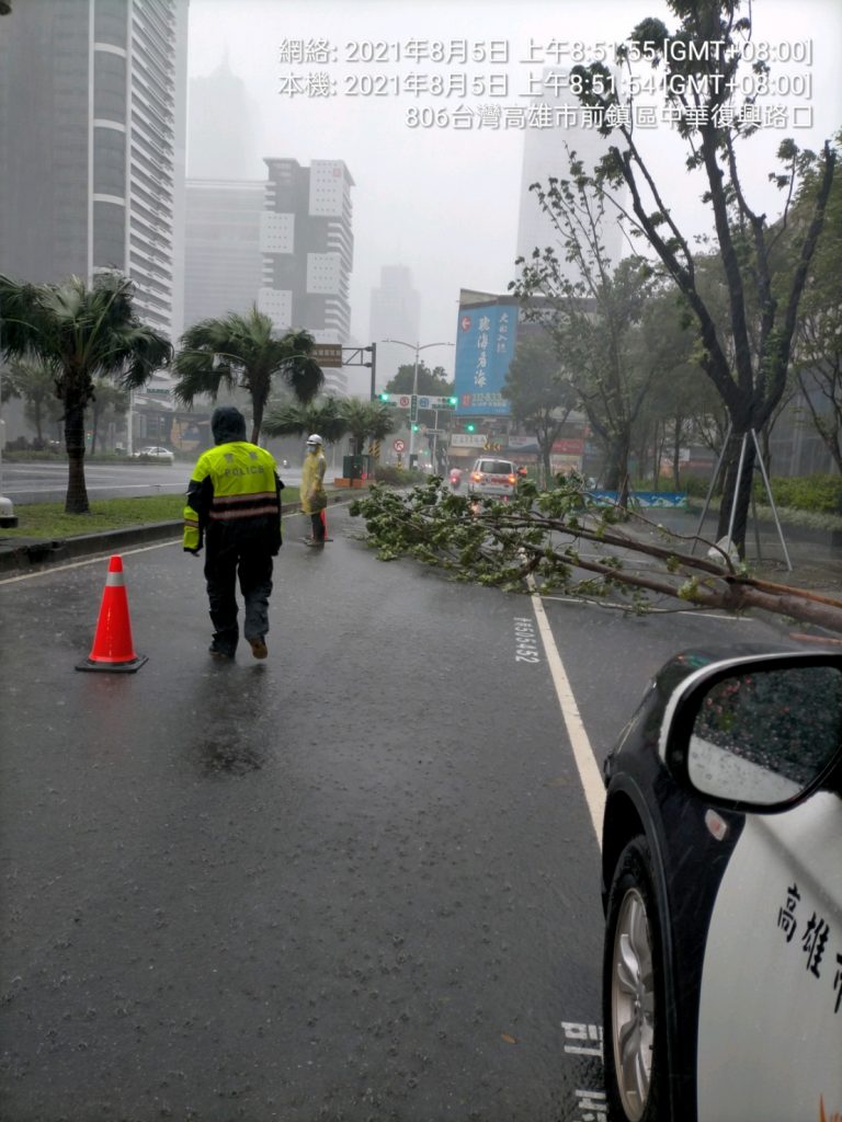 巡佐陳信仁、警員沈玉雯趕赴現場後,發現樹木橫躺機車道已嚴重影響通行,隨即設置交通錐警示指揮交通,冒雨將路樹暫搬移至路旁,防止通行人車發生意外,同時通報養工處及清潔隊前來處理,而在路旁建築工地工程人員見狀也暖心伸出援手,出動工程機具協助排除路樹,恢復道路暢通,警民合作排除路況。