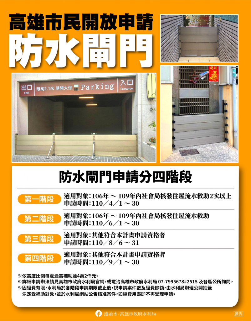 補助計畫第三階段申請期限至8/31止,水利局表示如果第三階段申請超出經費額度,將辦理公開抽籤決定受補助對象,並於水利局網站公告核准案件。有關「110年度高雄市民建置防水閘門(板)補助計畫」已公告於水利局官網,詳細資訊與文件請至水利局官方網站瀏覽下載,如有相關問題可電洽高雄市政府水利局或各區公所詢問。
