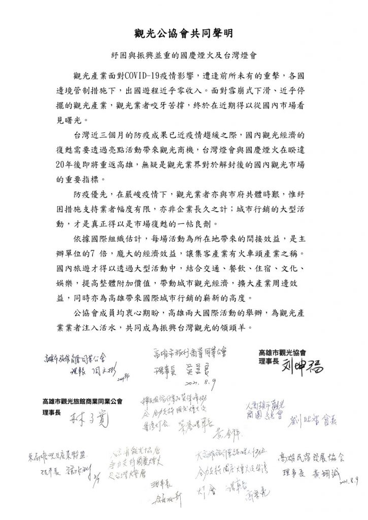 究竟人民期望什麼?有人認為疫情趨緩,紓困才是當務之急,但也有人認為振興經濟就要有觀光活動,為哀鴻遍野的經濟慘況注入活水!高雄市觀光公協會昨晚發出聲明表示,台灣近三個月防疫成果已近疫情趨緩之際,國內觀光經濟的復甦需要透過亮點活動帶來觀光商機,台灣燈會與國慶煙火在睽違20年後,即將重返高雄,無疑是觀光業界對於解封後的國內觀光市場的重要指標,聲明強調,城市行銷的大型活動,才是真正讓市場復甦的一帖良劑。