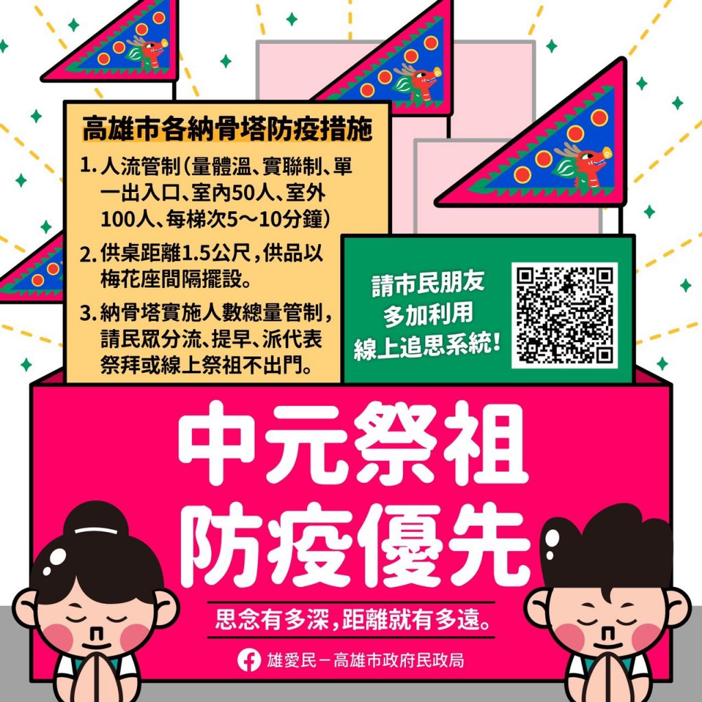中元祭祖,防疫優先,高雄市殯葬管理處在中元節期間(8/8起到9/6)各靈骨塔都採單一入口、人數總量管制,同時進行測量額溫、酒精消毒、實聯制等防疫措施,另外增加搭設棚架及桌次,各桌距離1.5公尺採梅花座間隔擺設,提醒民眾,法師誦經祈福儀式,不繞場、不拋撒銅錢及糖果,也不開放隨同祭拜,或不出門利用線上祭拜追思平台。