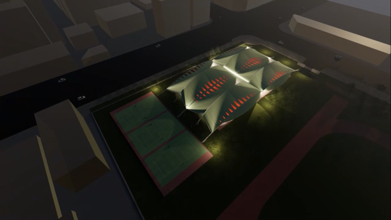 新建球場基地以明華國中校花「莿桐花」為意象,象徵球場為學校、社區共生共榮的活動空間,提倡校園開放與社區資源共享,打造北高雄首座指標性都會型籃球場。