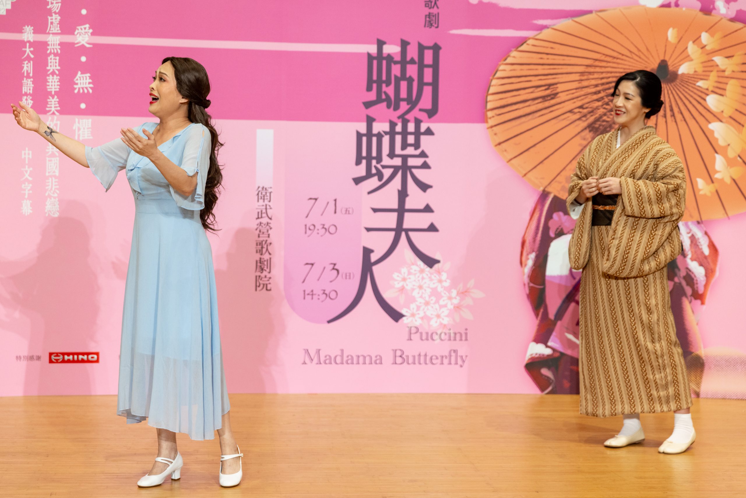 首次公開全劇最關鍵的服裝造型,高雄春藝近日密集彩排期間,特別安排主要演員一起拍攝演出前定裝照,邀請包括:全劇領頭羊導演-馬修‧巴克利(Matthew Barclay)、女高音-林玲慧(蝴蝶)、美國男高音-理查.卓克希爾 Richard Troxell(平克頓)、次女高音-翁若珮(鈴木)、男中音-巫白玉璽(夏普萊斯)、張殷齊(五郎) 、羅俊穎(叔叔)、李增銘(山鳥)、王郁馨(凱特)、謝銘謀(領事官)一起在記者會上穿著劇中服飾扮相演唱四段精彩畫面亮麗登場。
