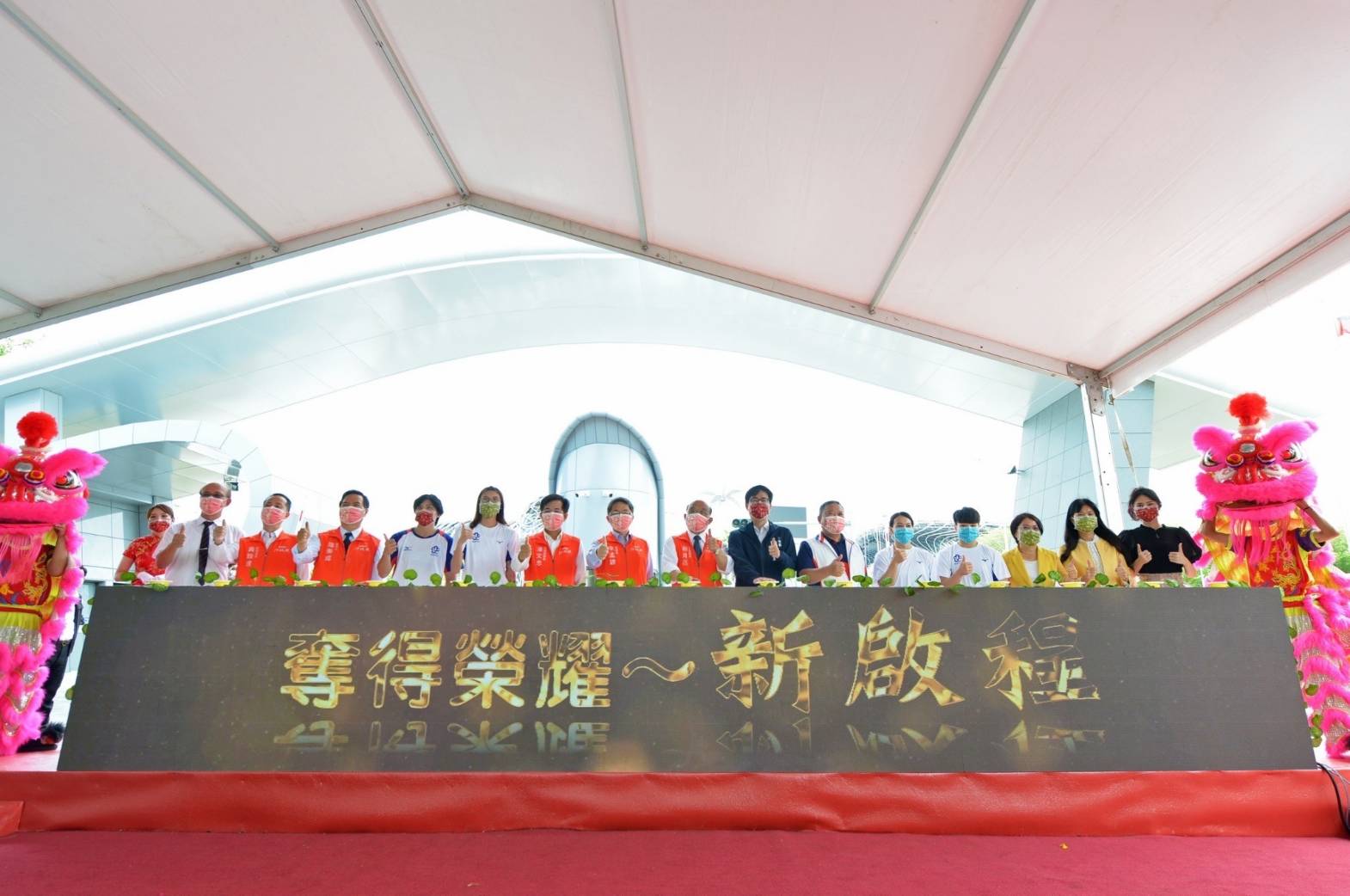 經現場嘉賓共同按壓啟動鈕,完成新建大門啟用儀式,並至國家運動科學中心籌備處,完成籌備處揭牌儀式。隨後,一行人參訪田徑場鉛球投擲區及風雨跑道區,除了觀看訓練選手示範,也聽取運動科學儀器的測量說明,另參觀運動醫務防護室、重量訓練室、選手宿舍及選手餐廳,慰勞防護員、營養師等相關工作同仁的辛勞及努力。