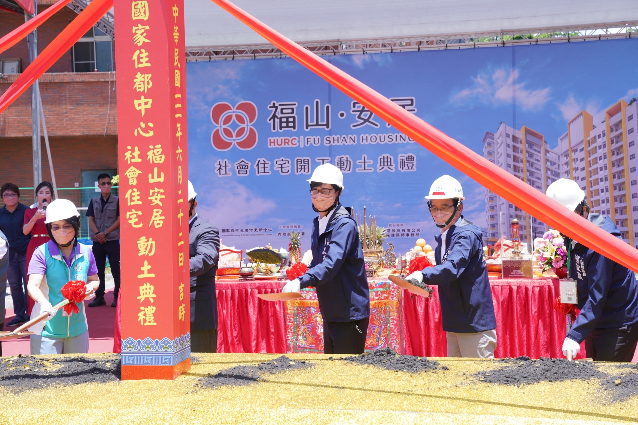 高雄社會住宅興建工程如火如荼進行,6/22高雄市長陳其邁陪同內政部政務次長花敬群出席左營福山安居社宅開工典禮,立法委員劉世芳與市議員李雅芬、陳麗珍、陳玫娟、李雅慧、李柏毅、黃文志及在地里長也到場動土祈求工程順利。本案中央在高雄從去年至今第六座動土社會住宅,陳其邁表示能有中央的資源來加速推動高雄的社會住宅政策,市府樂觀其成。高雄市政府目標是超過1萬戶社會住宅盼落實居住正義,此外市府也透過多元配套如課徵囤房稅增加3億稅收,並擴大租金補貼規模,讓更多年輕朋友受惠,減輕經濟負擔。