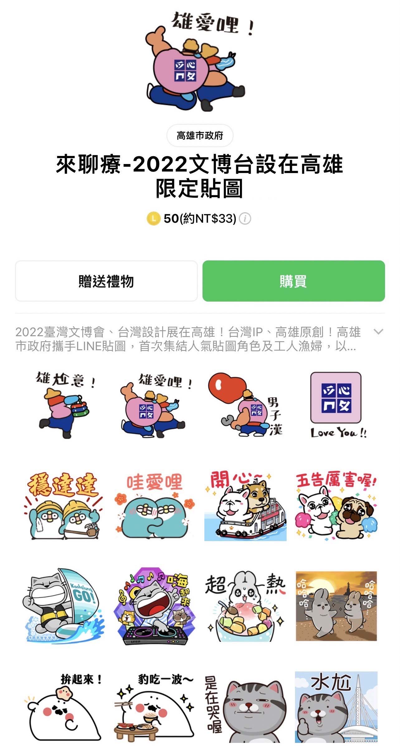 為迎接2022臺灣文博會及台灣設計展在高雄,高市府攜手LINE貼圖邀請6位來自高雄的「台灣IP」超人氣貼圖明星,包含貓爪抓、塔仔不正經、無所事事小海豹、ㄇㄚˊ幾兔、豆卡頻道、PP mini小小企鵝,作為「2022臺灣文博會及台灣設計展在高雄」活動大使。