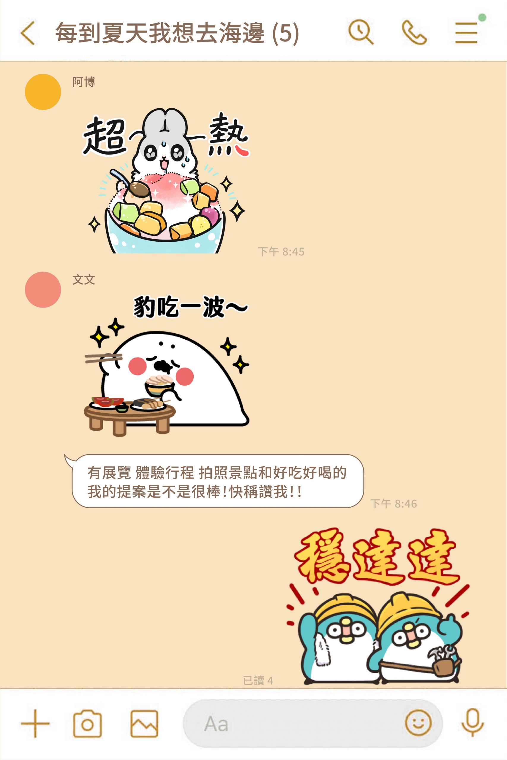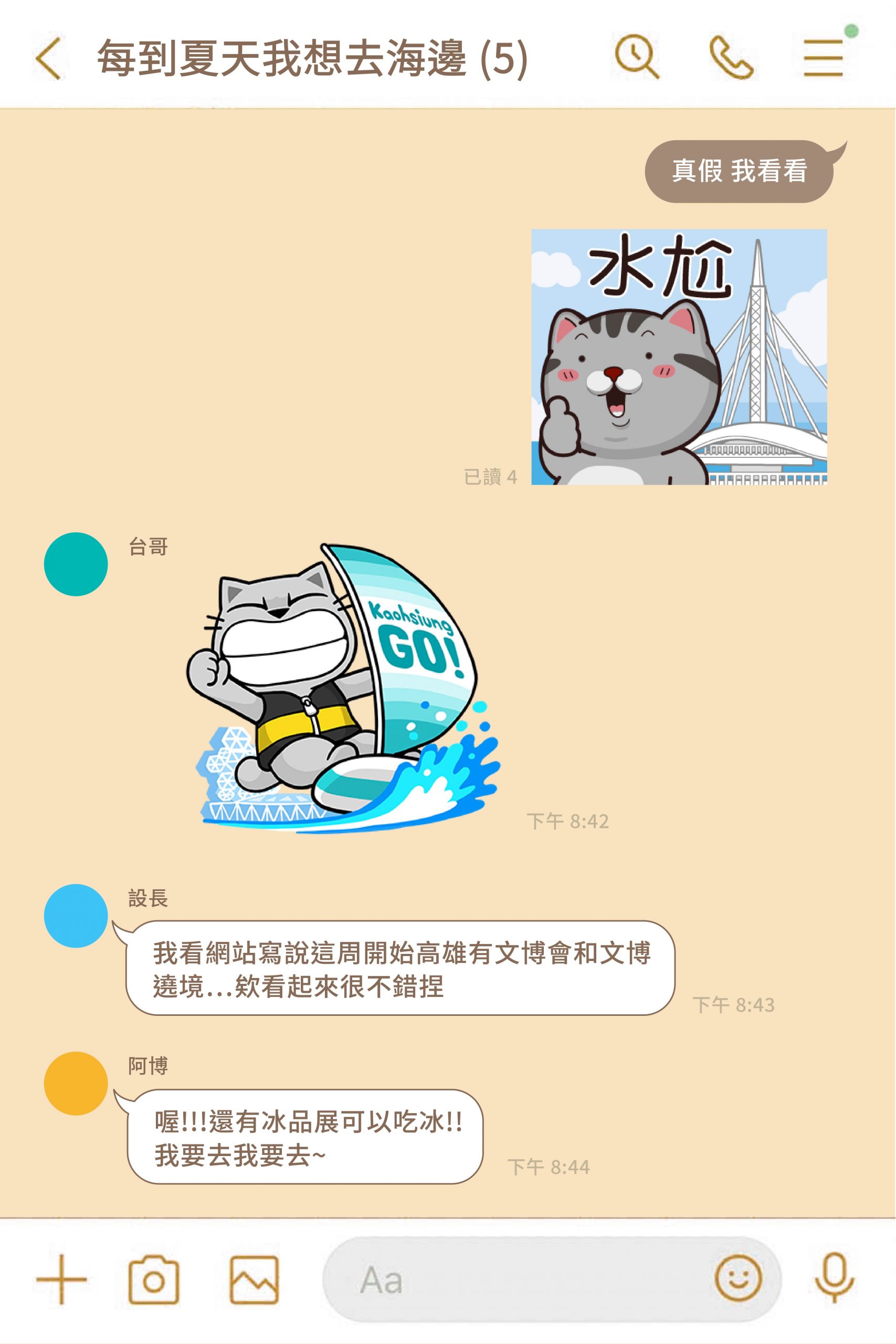 這組綜合貼圖裡,無論是無所事事小海豹「拚起來」「豹吃」高雄特色小吃、ㄇㄚˊ幾兔「超熱」的抱著大碗公冰、豆卡頻道裡茶包與飯丸搭著渡輪「開心」出遊、PP mini小小企鵝以高雄市花─木棉花相擁「哇愛哩」、塔仔不正經在大港橋前直呼「水尬」、貓爪抓在高雄流行音樂中心前「揚帆出發」「嗨聽音樂」,還有最具高雄意象的工人漁婦以「Love You」傳情。
