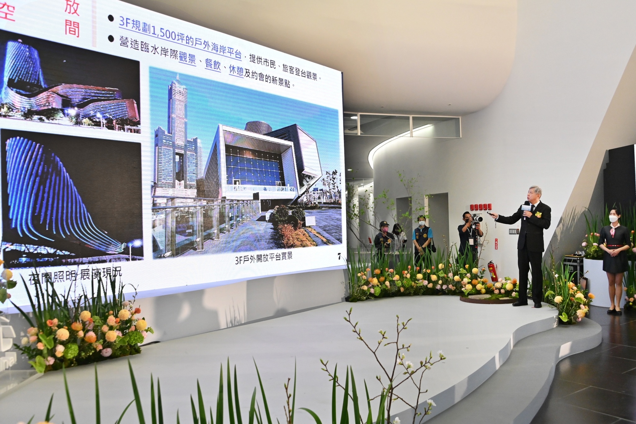 今日啟用典禮在「南台灣交響樂團」演奏組曲樂聲中熱鬧開場,陳院長首先聽取高雄港旅運中心李賢義董事長簡報「高雄港旅運中心興建與招商進度暨郵輪產業推動情形」,並於致詞後,與現場貴賓一同進行剪綵儀式及合影。隨後一行人由高雄港務分公司王錦榮總經理導覽,一同前往3樓和首航郵輪「七海探索者號」合影,為今日活動留下珍貴畫面。