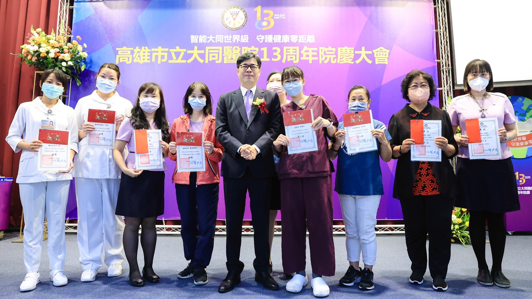 高雄市立大同醫院3/29舉辦13周年院慶,同時Newsweek公布的「全球最佳醫院」也榜上有名,高雄市長陳其邁致詞表示,大同醫院提供最好的醫療服務給所有市民,特別是疫情期間,晚上執行大量PCR採檢,焚膏繼晷、不眠不休,和市民唇齒相依,更是市民健康的守護神。