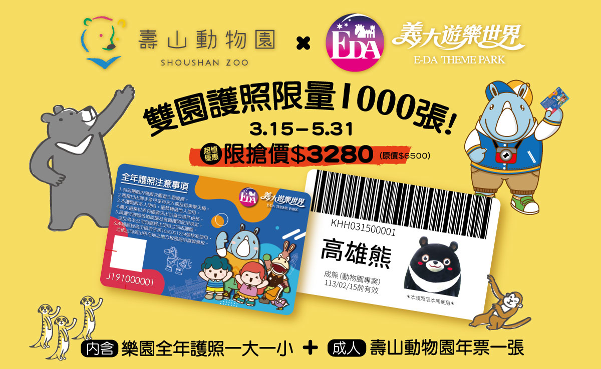 觀光局表示,壽山動物園有深受小朋友喜愛的明星動物陣容,連假期間特別開放全國12歲以下兒童免費入場,5月31日前,在義大遊樂世界網路商城,購買破盤價5折的限量「壽山動物園加義大遊樂世界」雙園全年暢遊護照,還可享親子1年無限次暢遊雙園。