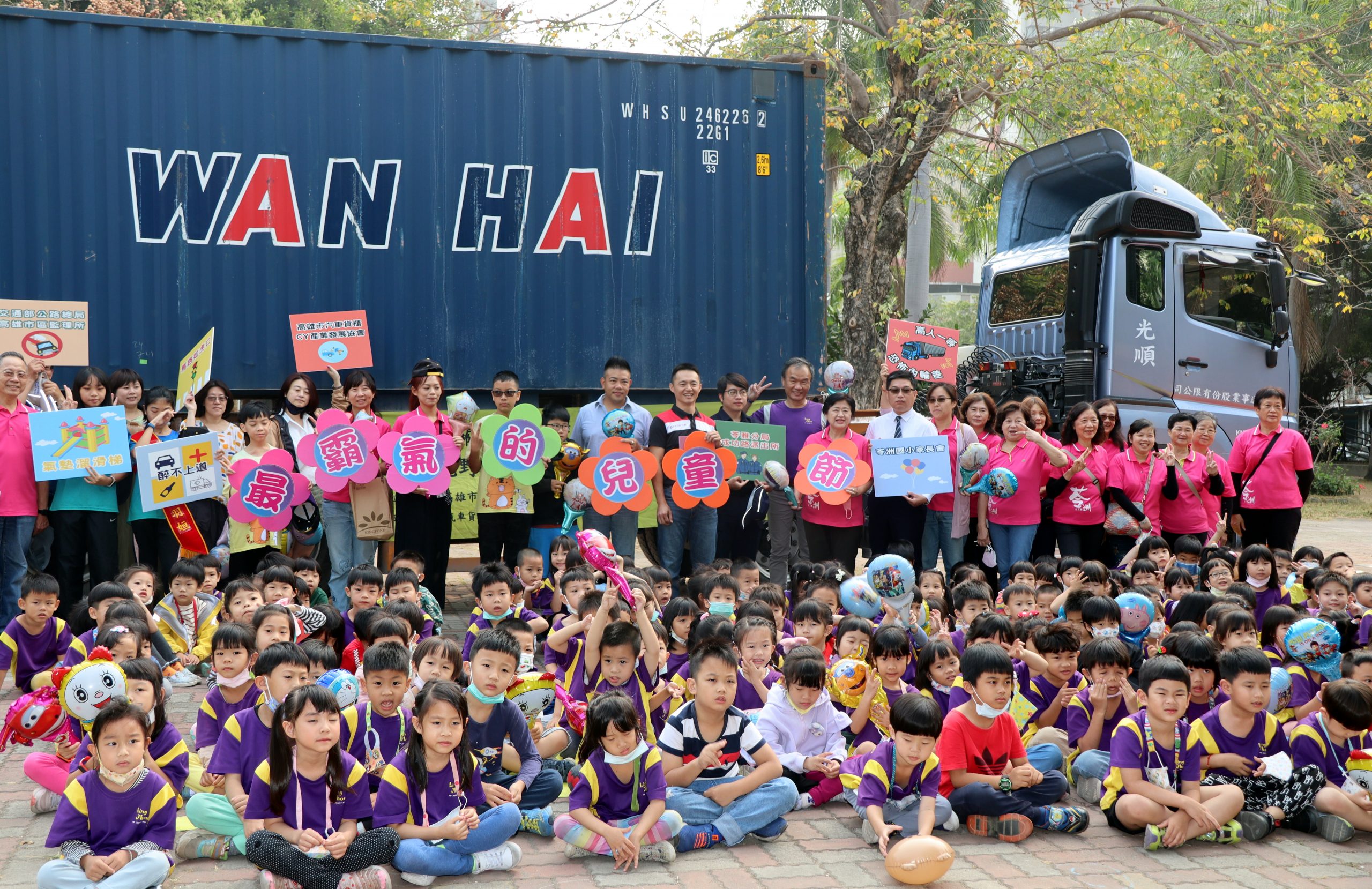 最霸氣的兒童節禮物,苓洲國小慶祝兒童節,3/30將大型貨櫃車開進校園,讓學生上車體驗「視野死角」,了解內輪差帶來的風險與危險,同時翻轉上下課時間,讓學生盡情爽玩超大型氣墊溜滑梯40分鐘,度過一個「最霸氣的兒童節」。