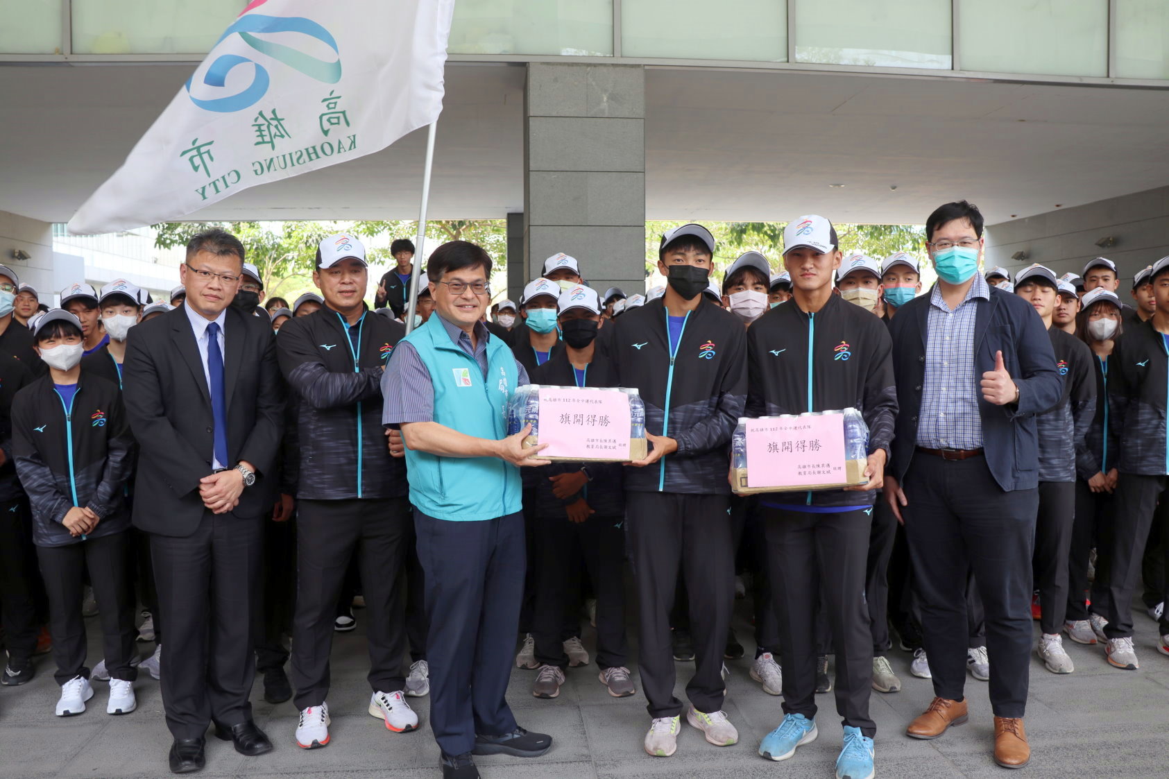局長謝文斌授旗時特別感謝大同醫院對高雄市選手的支持,並強調教育局關心選手安全與運動防護,希望藉由大同醫院的專業服務,成為選手努力奪牌的最佳後盾。他表示,高雄市各校代表隊已積極備戰,舉重、羽球、網球、田徑、自由車等,都是高雄市熱門奪牌種類。