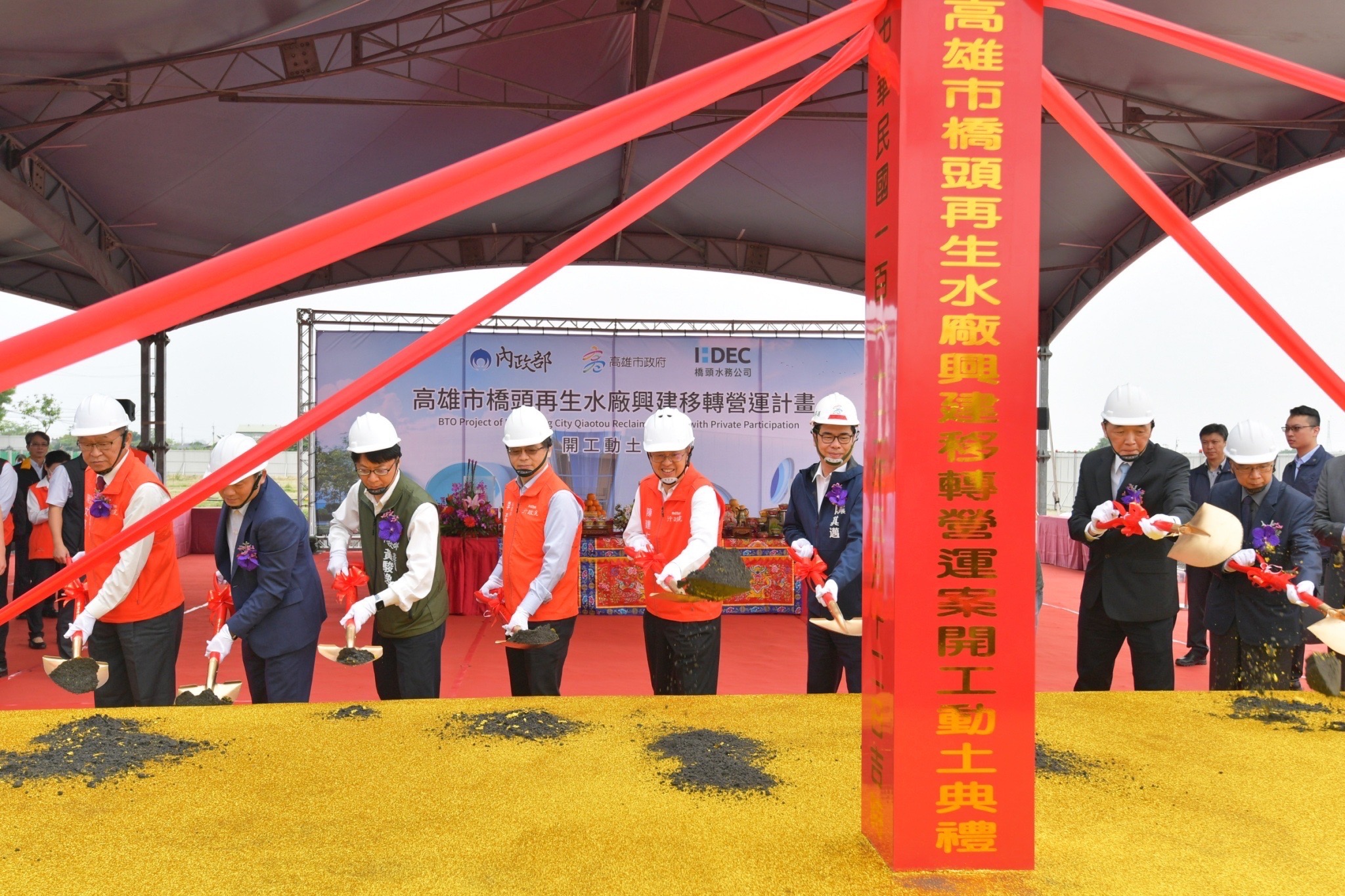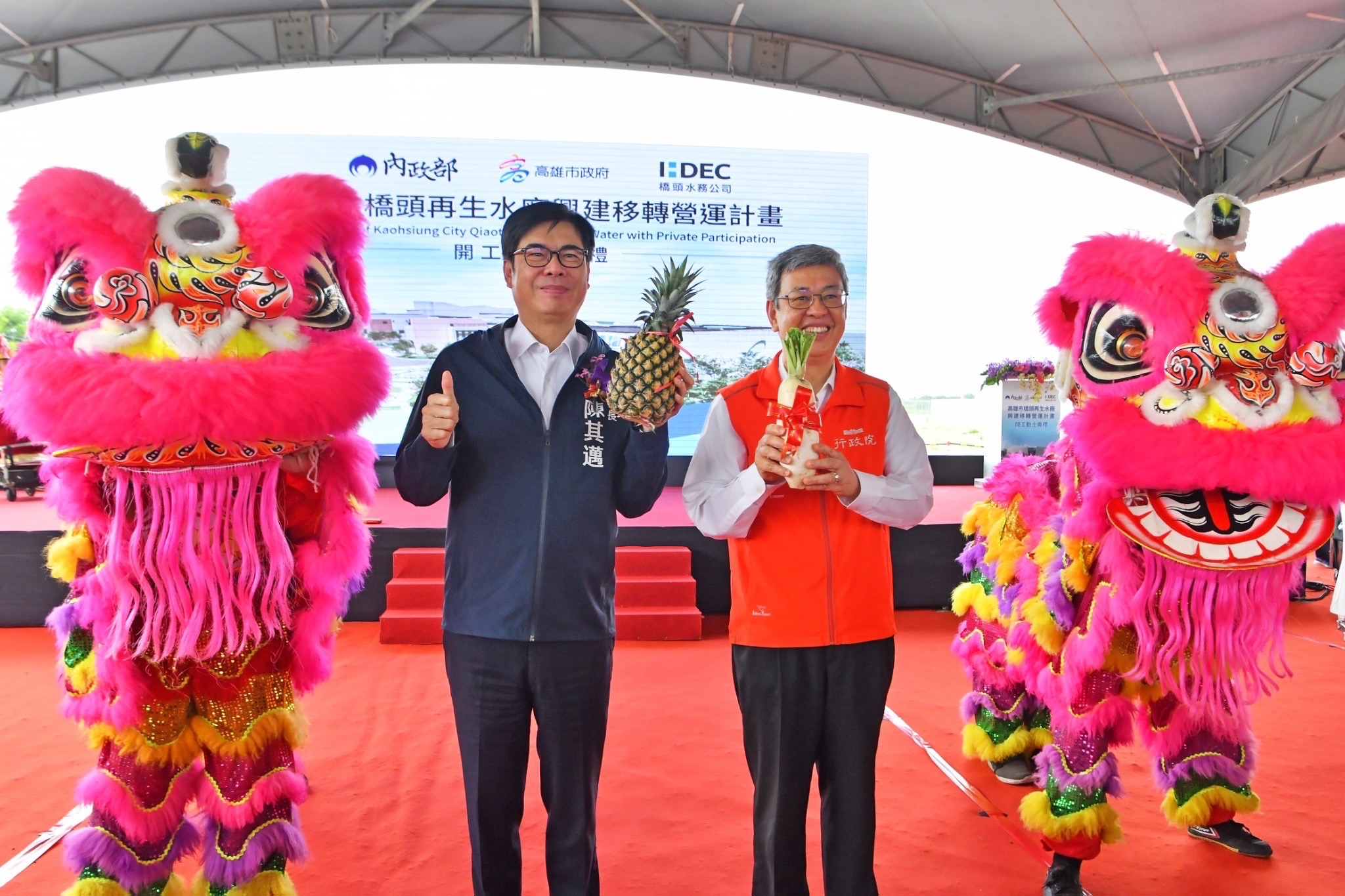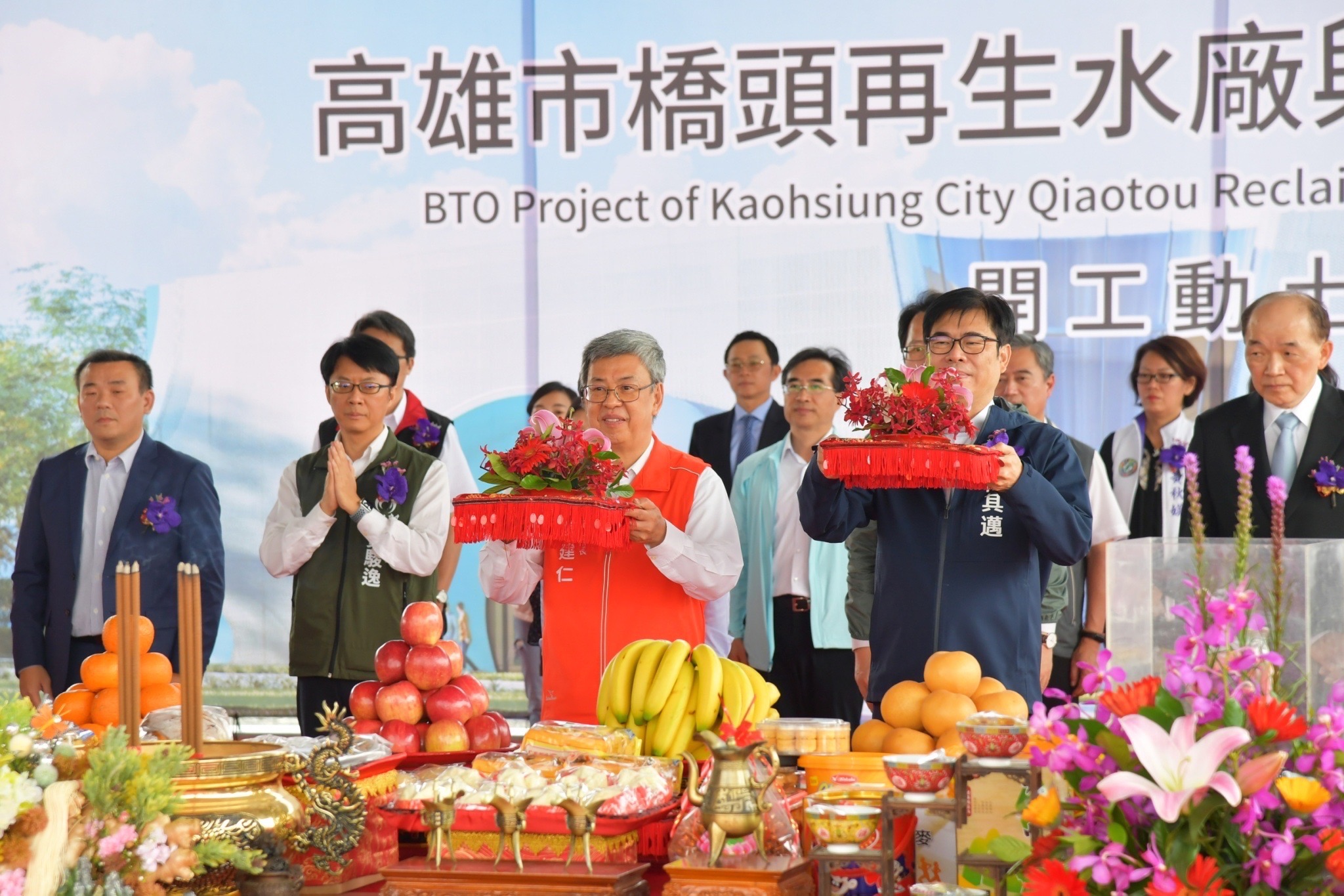 行政院長陳建仁5/12前往高雄市出席「橋頭再生水廠興建移轉營運計畫」開工動土典禮時表示,陳其邁市長上任後,積極招商引資及推動高雄產業轉型,持續朝高科技、智慧化、低碳化的方向發展,並成功爭取台積電、美商半導體材料公司英特格(Entegris)在高雄設廠。政府也透過興建再生水廠,積極解決高科技產業用水需求,未來橋頭再生水廠完工後,將全數供應進駐楠梓產業園區的廠商使用,至盼該工程能夠如期如質完工,進一步帶動高雄整體產業發展。