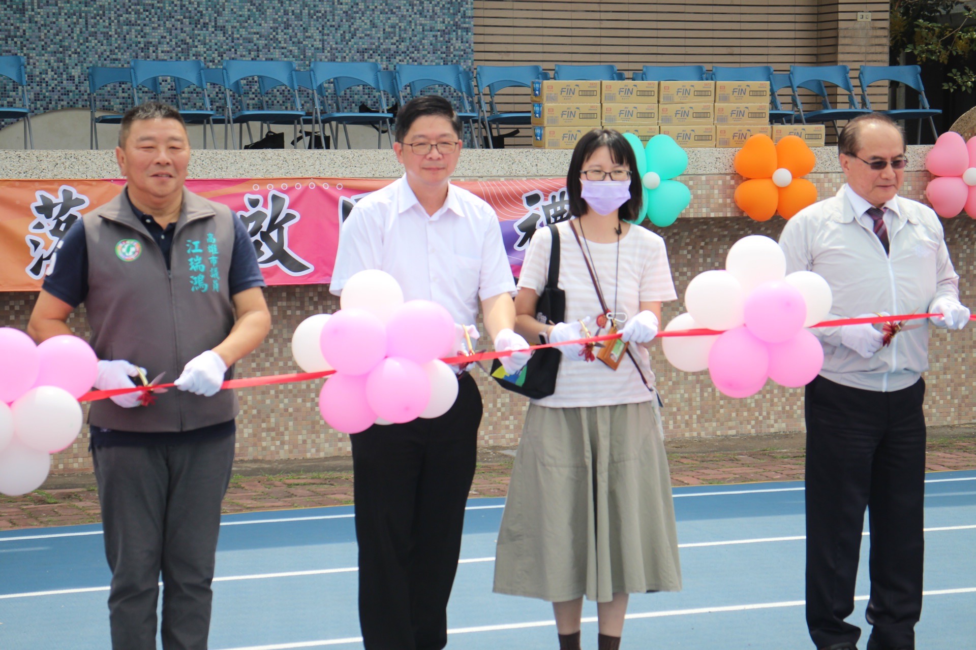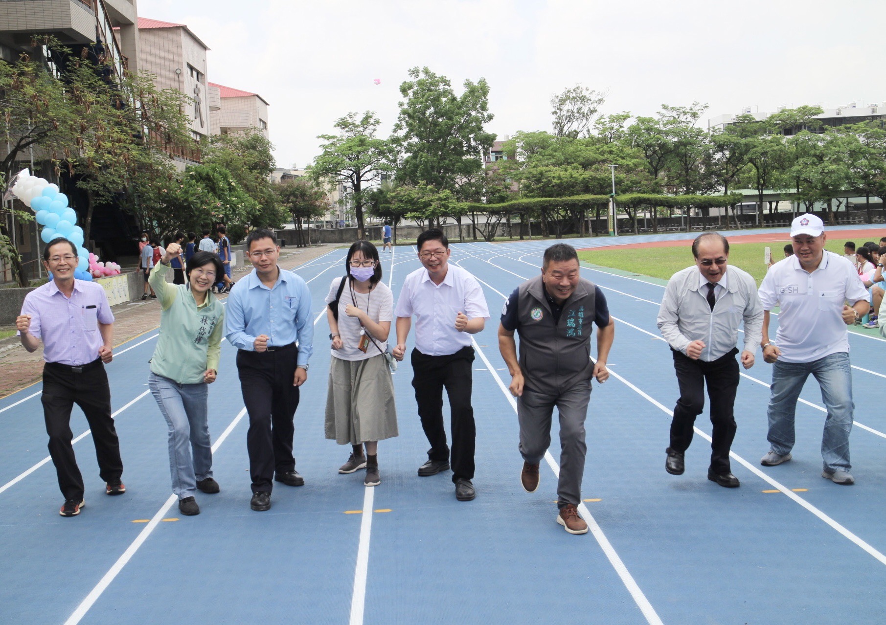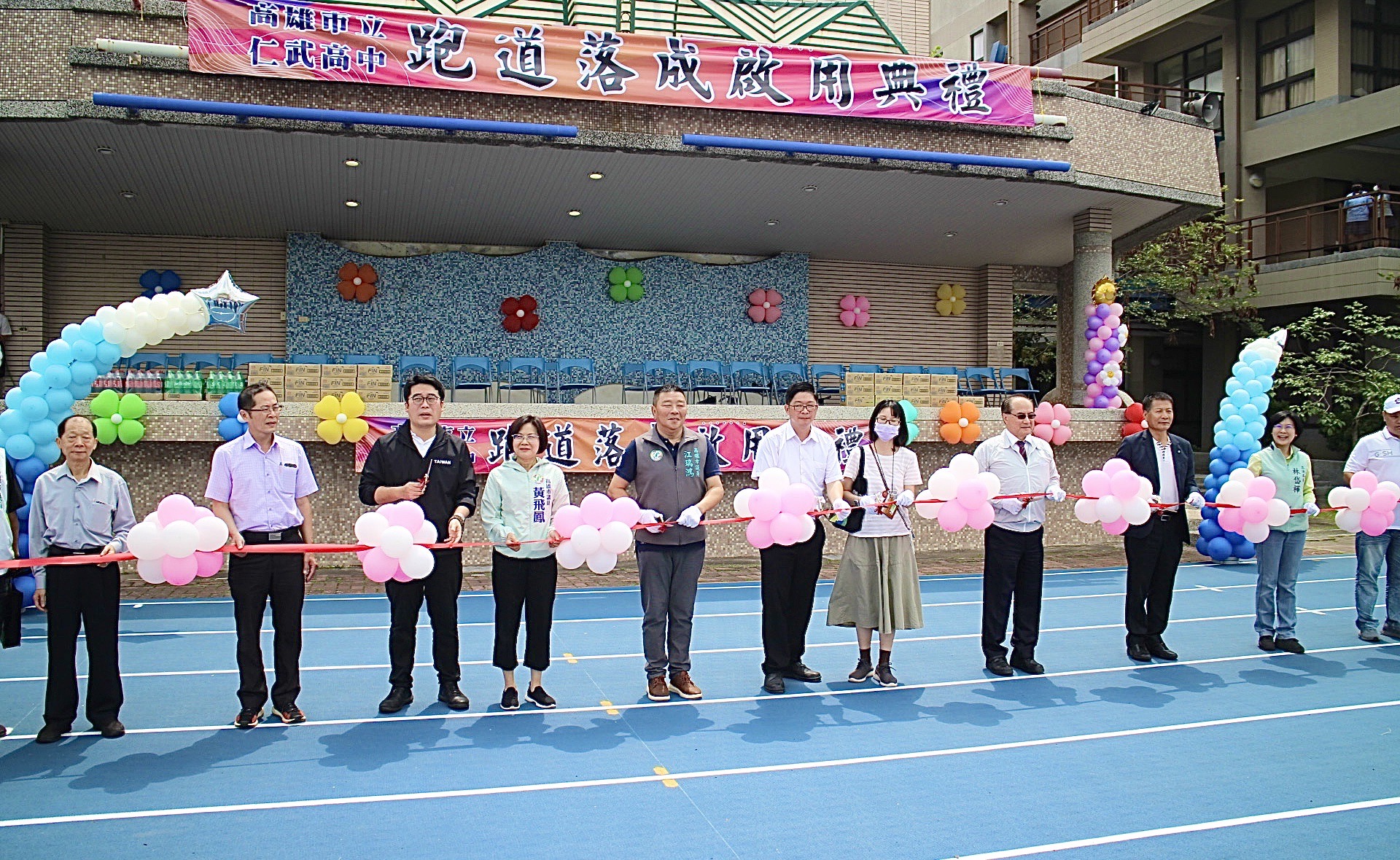 與會嘉賓一起擔任剪綵官啟用嶄新的操場跑道,眾人手持金剪,剪綵的瞬間有氣球冉冉上昇往天空飛揚,象徵仁武高中學生未來一飛衝天,跑道啟用後緊接著接續大隊接力活動,讓學生在嶄新的場域中,大展身手。
