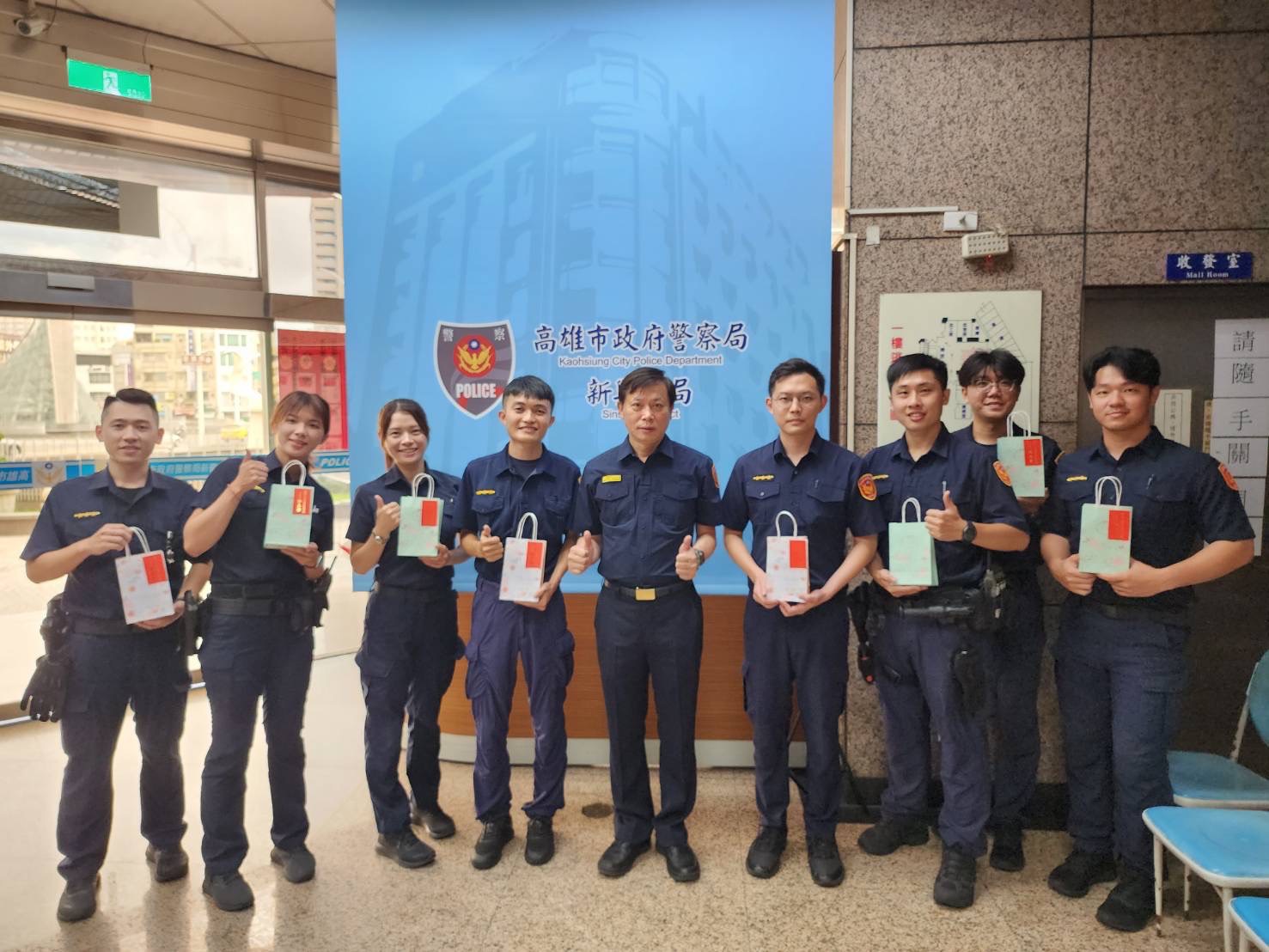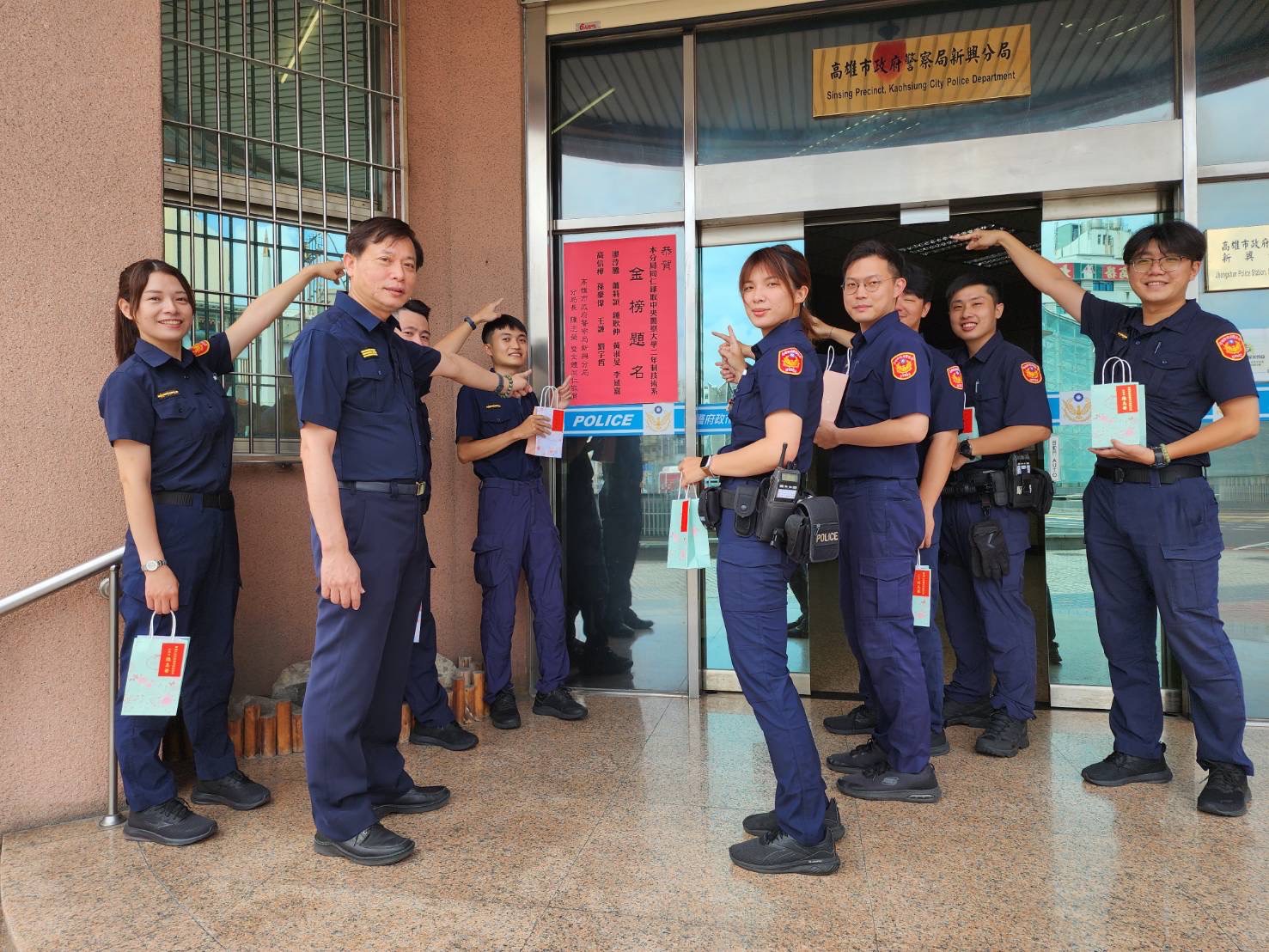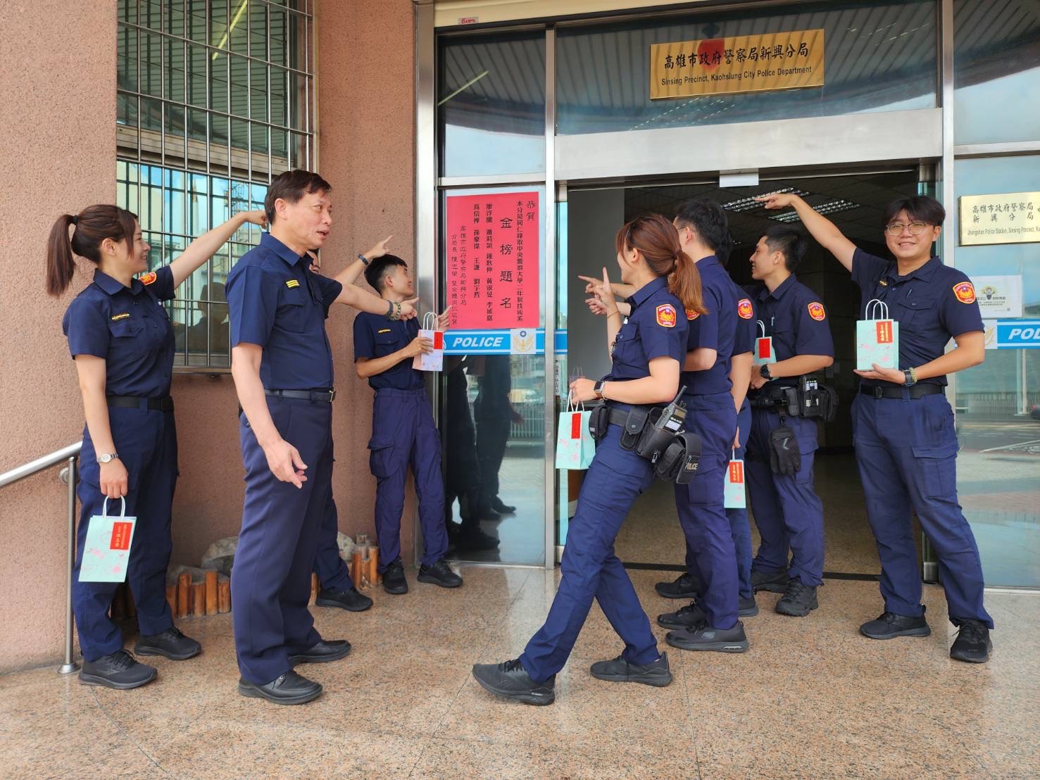 新興分局長陳志榮在放榜隔日(6/18)親赴各所張貼紅榜,除恭喜錄取人員外,也鼓勵其他同仁積極投入工作,勤餘多看書向上發展,展現不一樣的職場生涯,並代表分局與新興警友辦事處致贈鋼珠筆,勉勵此次上榜的9名同仁,能在學校精進專業,學習成為一位優秀的警察幹部,未來能以更專業的學識與經驗服務社會大眾。