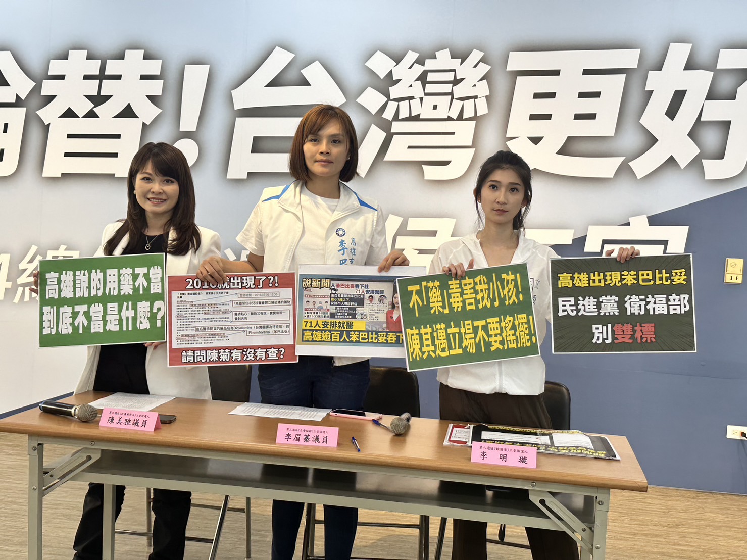有關高雄市不當用藥案,國民黨高雄市立委參選人第三選區(左營楠梓)李眉蓁、第六選區(鼓山鹽埕前金新興苓雅)陳美雅、第八選區(前鎮小港旗津)李明璇6/21下午於高雄市黨部開記者會,質疑高雄淪為苯巴比妥天堂?要民進黨不要雙標!立場不要搖擺!衛福部和陳其邁要出來講清楚說明白。
