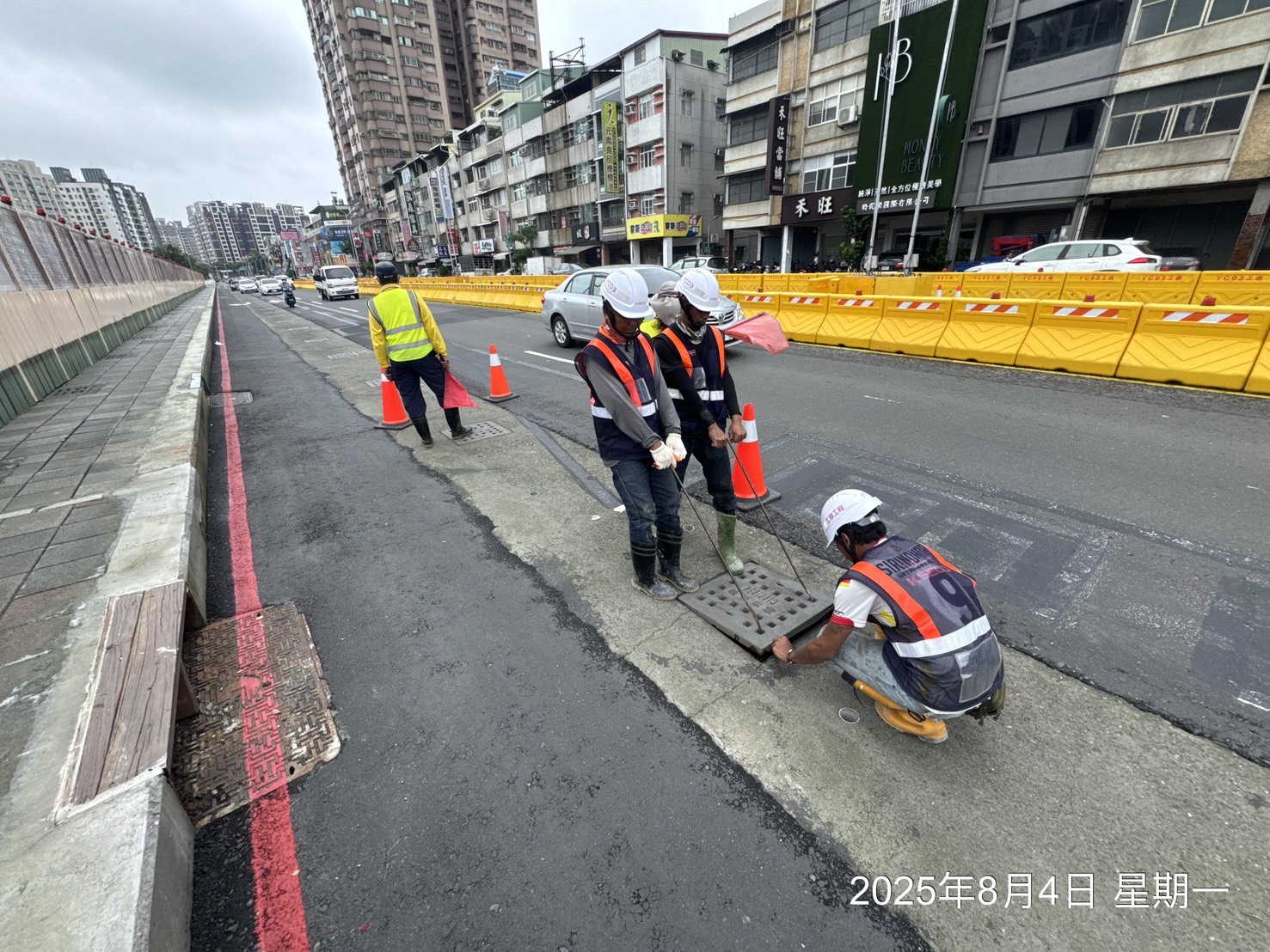 為避免人行道縮減後,側溝與車道之間產生高低落差影響用路安全,施工團隊已完成沿線水溝蓋降噪、防滑及加裝橡膠墊作業,不僅降低車輛經過時的噪音與震動,也減少輪胎跳動情況,提升行車穩定性。